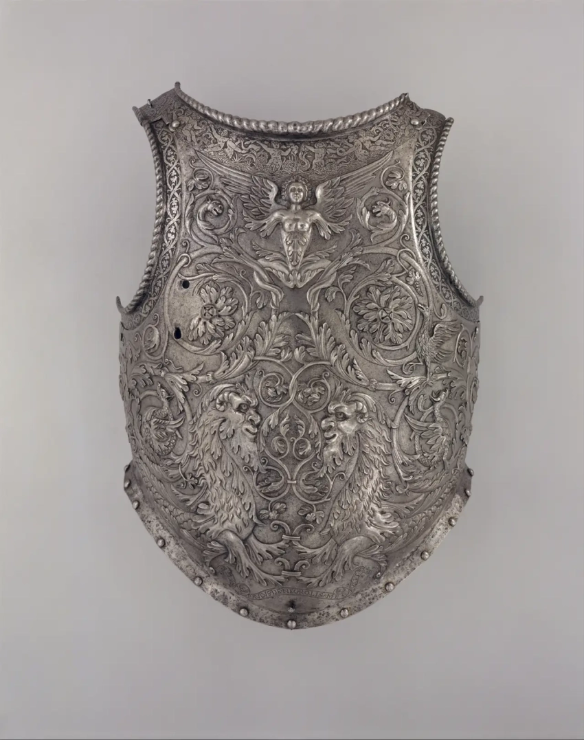 Нагрудник, ранее входивший в состав парадных доспехов, является единственной подписанной работой Джованни Паоло Негроли, двоюродного брата более известного Филиппо Негроли. Изначально поверхность нагрудника была красновато-коричневой, а выпуклые и гравированные участки были позолочены. Вероятно, его цвет был очень похож на цвет шлема, который также приписывают Джованни Паоло