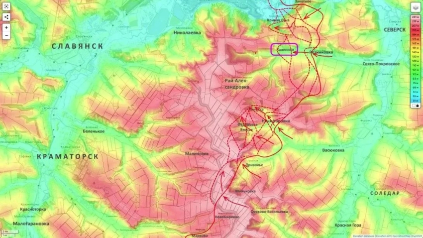 На Краматорско-Славянском фронте акцент боевых действий сместился к подступам Рай-Александровки. Накануне подтвердилось освобождение Калеников - важного населённого пункта, который сливается с Резниковкой и самой Рай-Александровкой в единую агломерацию. Движение по сплошной жилой застройке в низинах дает тактическое преимущество наступающим силам.
