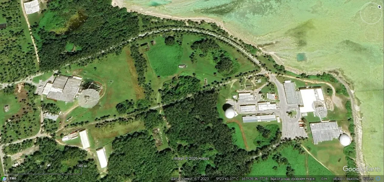 Спутниковый снимок Gооglе Еаrth: РЛС GBR-P на атолле Кваджалейн. Снимок сделан в октябре 2023 года