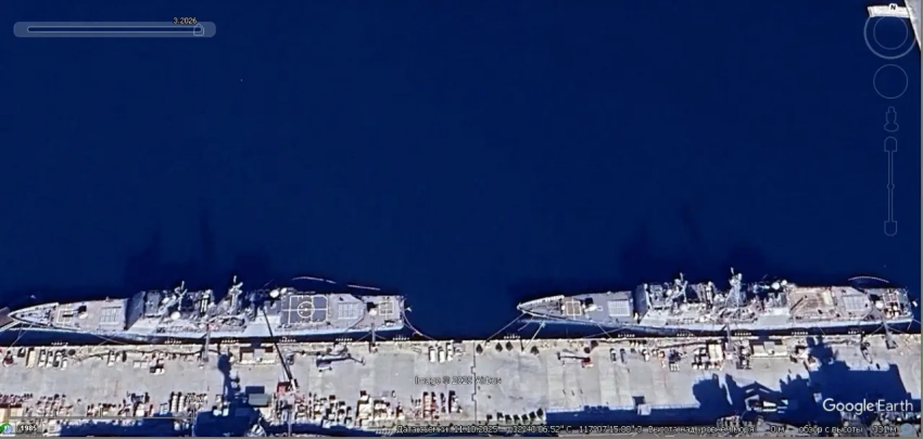 Спутниковый снимок Google Earth: крейсеры типа «Тикондерога» у пирса военно-морской базы Сан-Диего. Снимок сделан в ноябре 2025 года