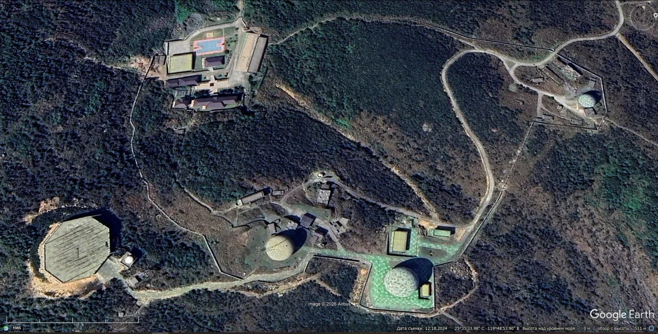 Спутниковый снимок Google Earth: РЛС YLC-8B в составе радиолокационного поста на острове Пинтан. Снимок сделан в декабре 2024 года