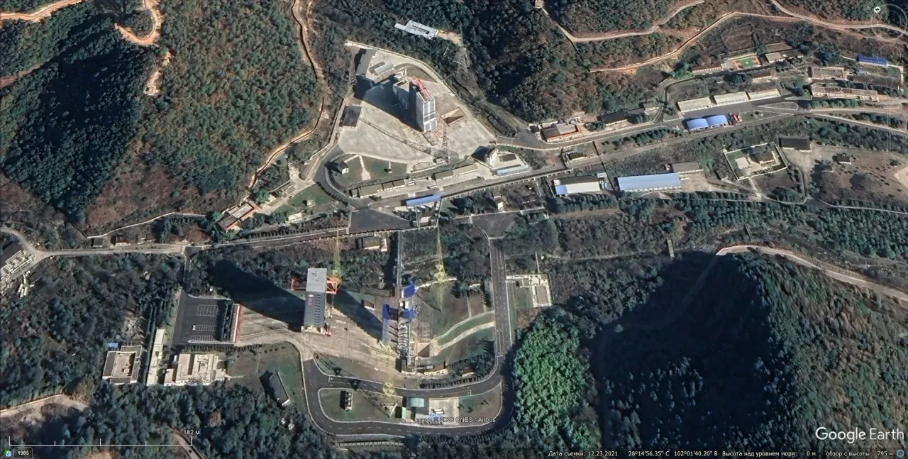 Спутниковый снимок Google Earth: сооружения космодрома Сичан. Снимок сделан в декабре 2021 года