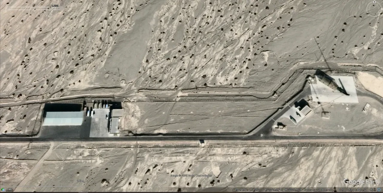 Спутниковый снимок Google Earth: испытательная площадка ракетного полигона Корла. На снимке видно, что самоходная пусковая установка частично прикрыта маскировочной сетью. Снимок сделан в январе 2021 года