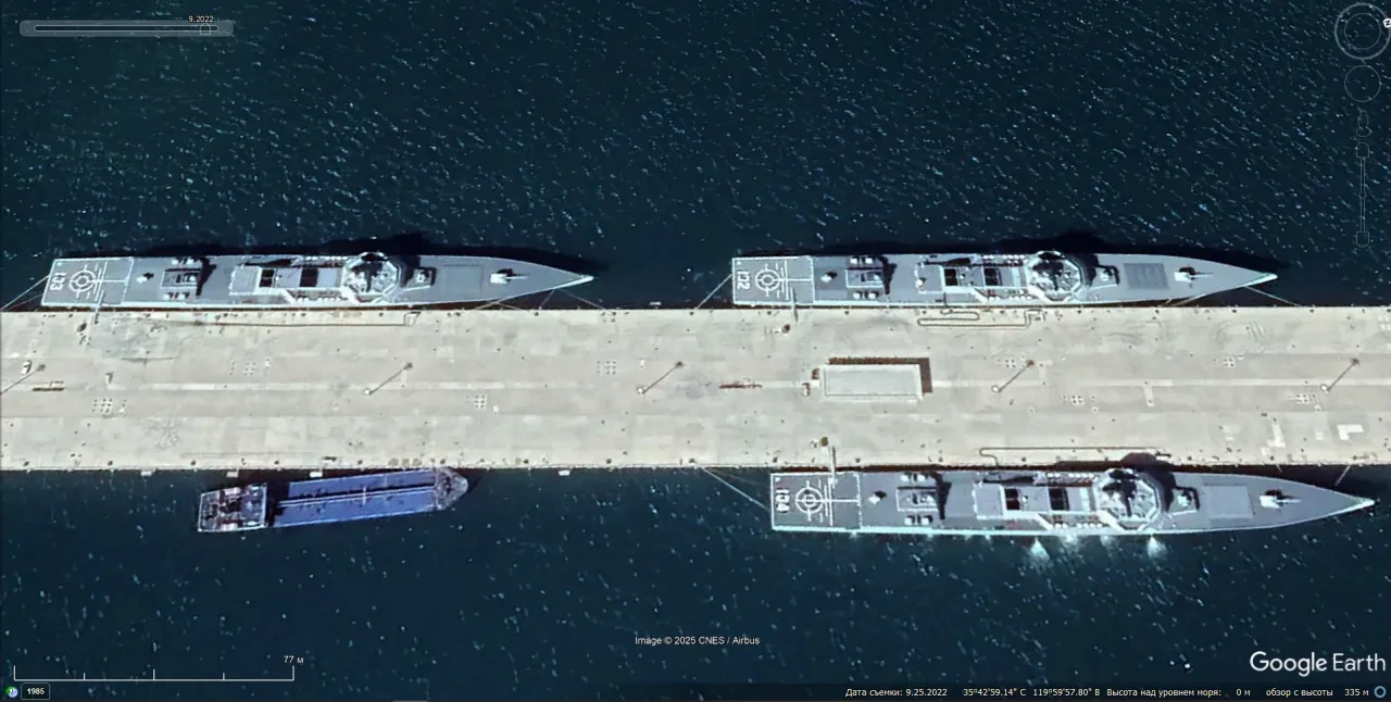 Спутниковый снимок Google Earth: эсминцы Type 055 Северного флота ВМС НОАК у пирса военно-морской базы Ючи. Снимок сделан в сентябре 2022 года