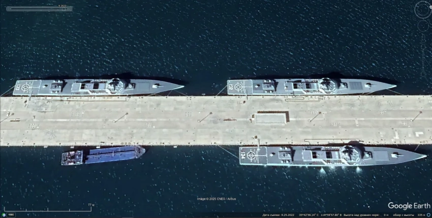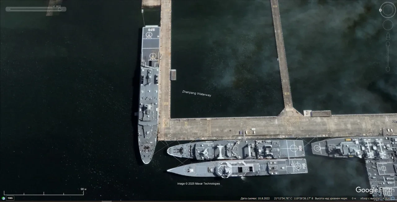 Спутниковый снимок Google Earth: эсминец Type 055, корабль снабжения и десантный корабль Южного флота у пирса военно-морской базы Чжаньцзян. Снимок сделан в октябре 2022 года
