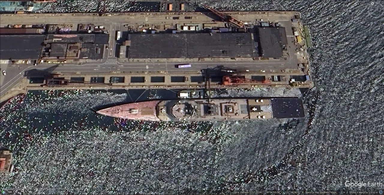 Спутниковый снимок Google Earth: эсминец Type 055 у достроечной стенки Даляньской судостроительной компании. Снимок сделан в мае 2024 года