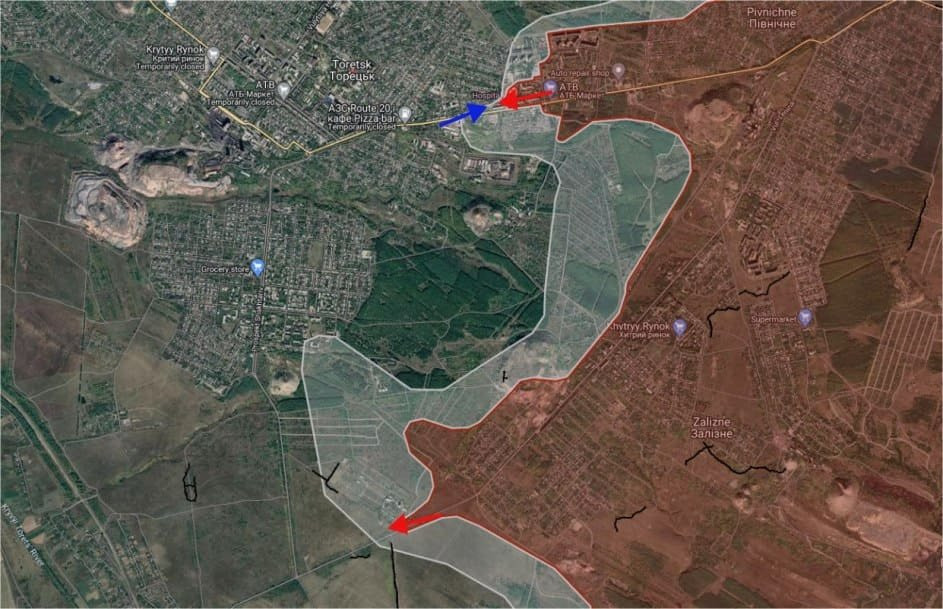 На Торецком направлении ВС РФ ведут штурмовые действия в районе ИК N2 и на территории шахты Новая. ВСУ пытались контратаковать в районе центральной городской больницы в Торецке, успехов не имели.