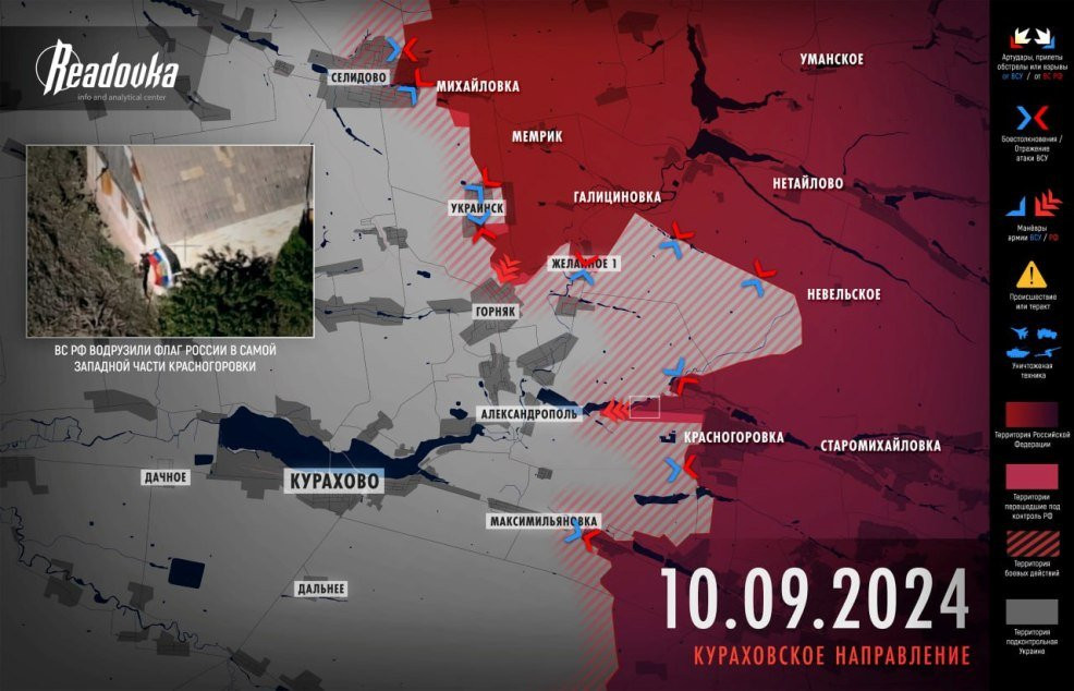 Но самое любопытное происходит на второй, параллельной ветке наступления на Кураховском направлении, там, где Желанное Первое и Второе. Между этими селами и Лесовкой образовался небольшой карман в низине, в котором оказались зажаты не успевшие отойти ВСУшники. Русская армия также заняла находящийся западнее Красногоровки дачный кооператив «Мечта», открыв дорогу на Александрополь и Кураховку.