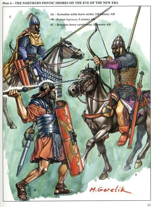 Воин-сармат (справа) и его противники (вверху и слева внизу). Иллюстрация М. Горелика из его книги «Warriors of Eurasia», опубликованной в Англии издательством «Montvert»