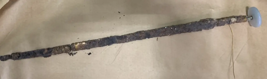 Очень интересное было крепление диска из халцедона. Его просто прибивали к рукоятке при помощи двух бронзовых «усов», которые охватывали при этом плоский железный черенок клинка…
