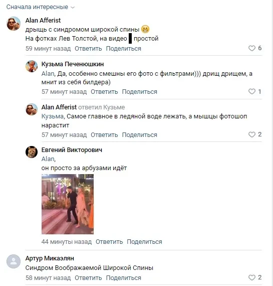 В сети вирусится видео случайной прохожей, в котором 40-летний Дуров идёт по улице с Юлией Вавиловой, и теперь комментаторы пишут, что формы миллиардера оказались куда скромнее, чем на фото из "качалки". Многих также повеселила походка Павла. Пользователям она напомнила мем про "синдром широкой спины": в сети так называют привычку мужчин после нескольких походов в спортзал неосознанно разводить руки чуть в стороны, будто у них выросли мышцы.