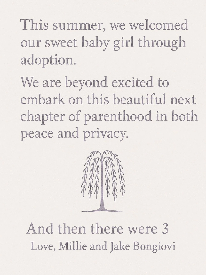 "Этим летом в нашу семью пришло счастье — мы усыновили чудесную девочку. С огромным трепетом начинаем новый этап родительства, полный уюта и гармонии", — гласит подпись на картинке, где изображена ива. В публикации пара также отметила: "И вот нас уже трое". При этом Милли не уточнила, когда именно это произошло, и предпочла не раскрывать имя ребёнка.