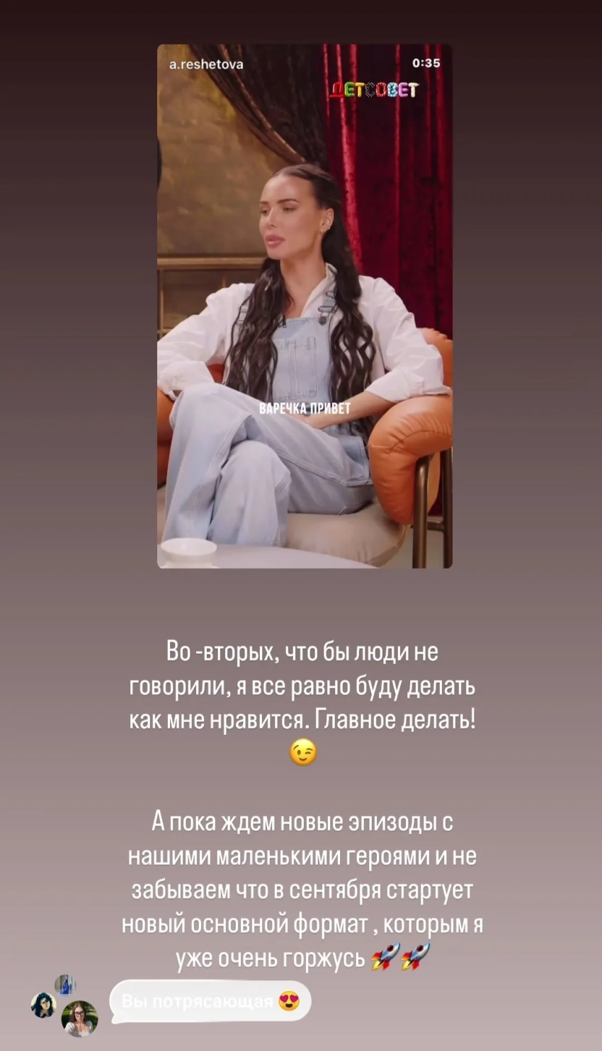 Скриншот из соцсетей Анастасии РешетовойПри этом Решетова отметила, что продолжит сниматься в новых эпизодах, где она "раскроется сильнее": "Я буду делать свой проект лучше и лучше. Никто не делает безукоризненно с первого раза. <...> Что бы люди ни говорили, я всё равно буду делать, как мне нравится. Главное — делать!".