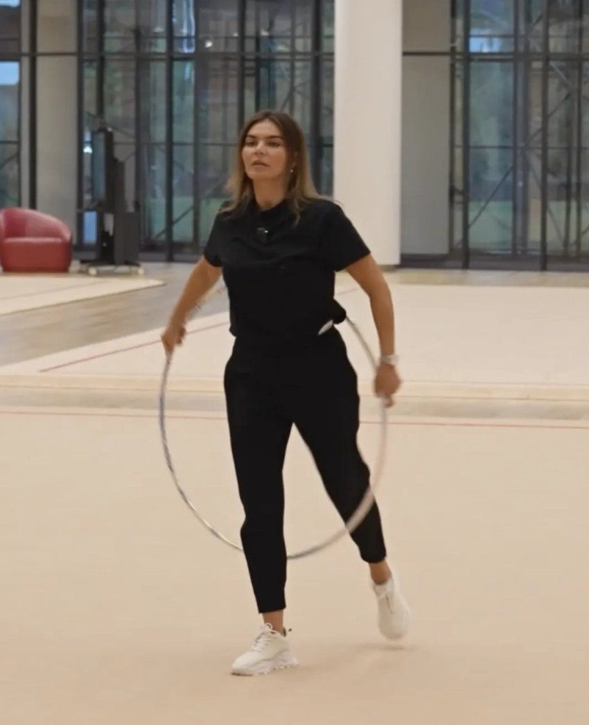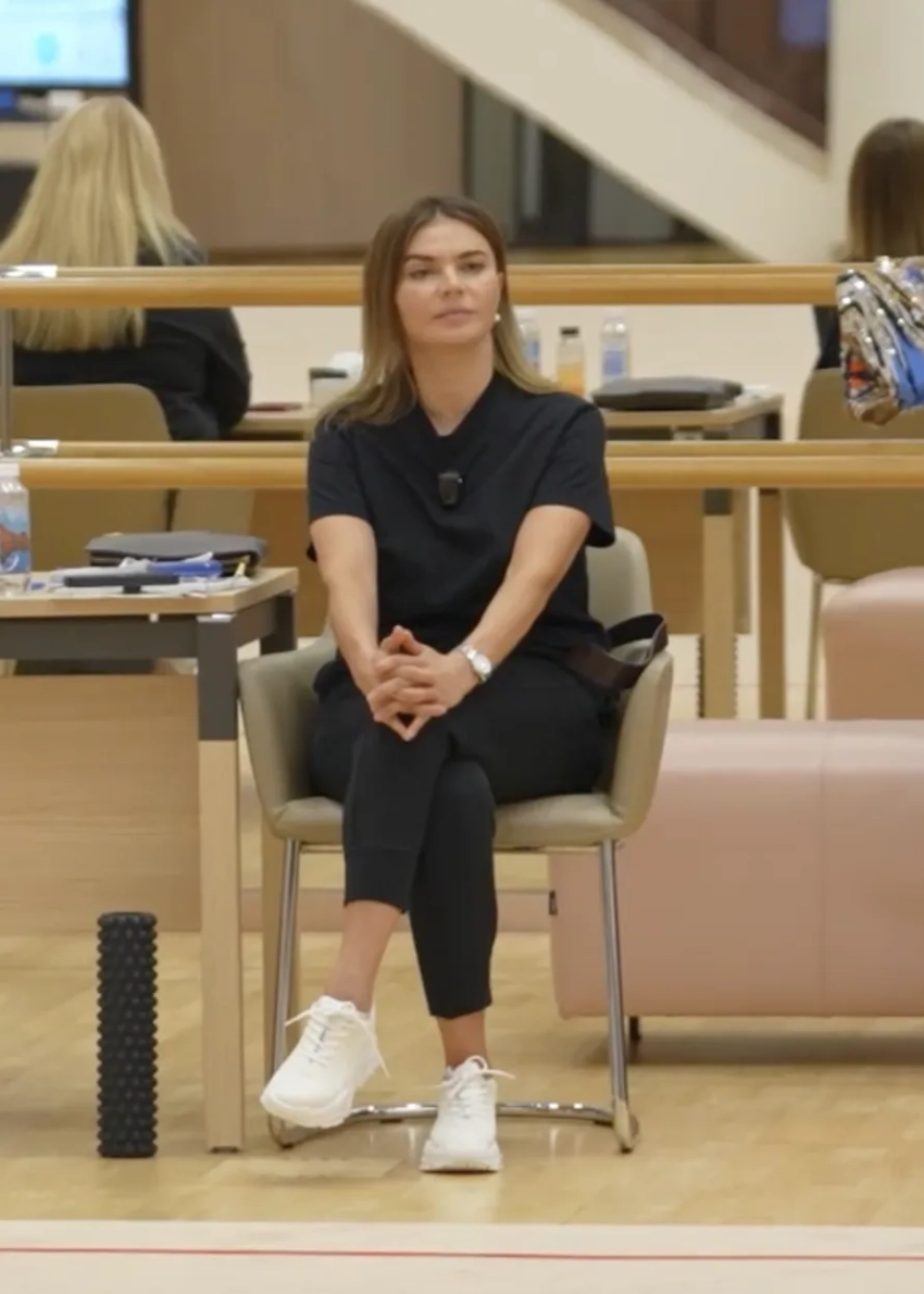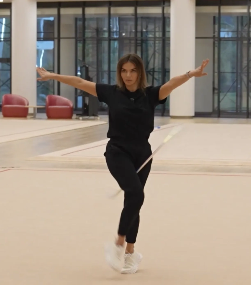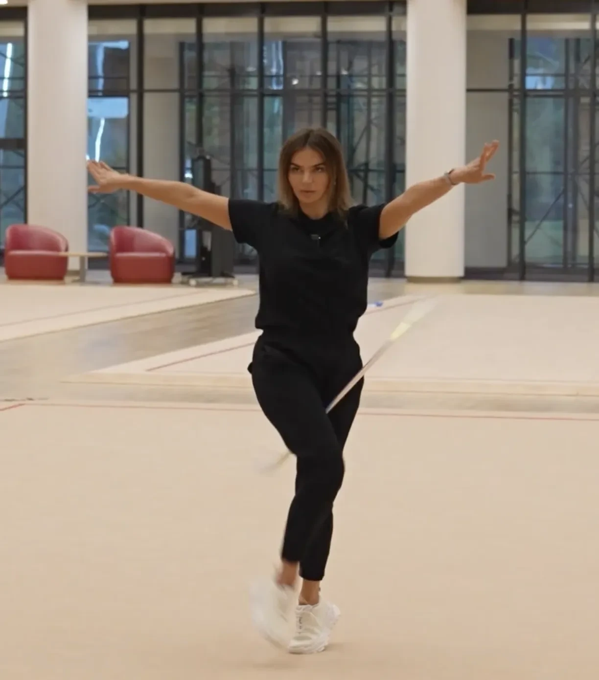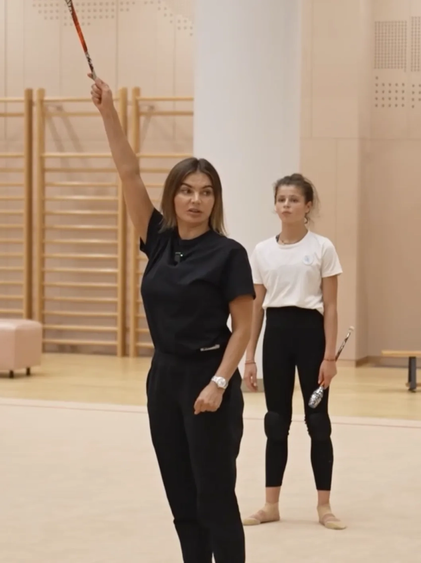 42-летняя олимпийская чемпионка появилась в зале в чёрной футболке, брюках и белых кроссовках. Кабаева не только наблюдала за работой воспитанниц, но и показывала им некоторые элементы.