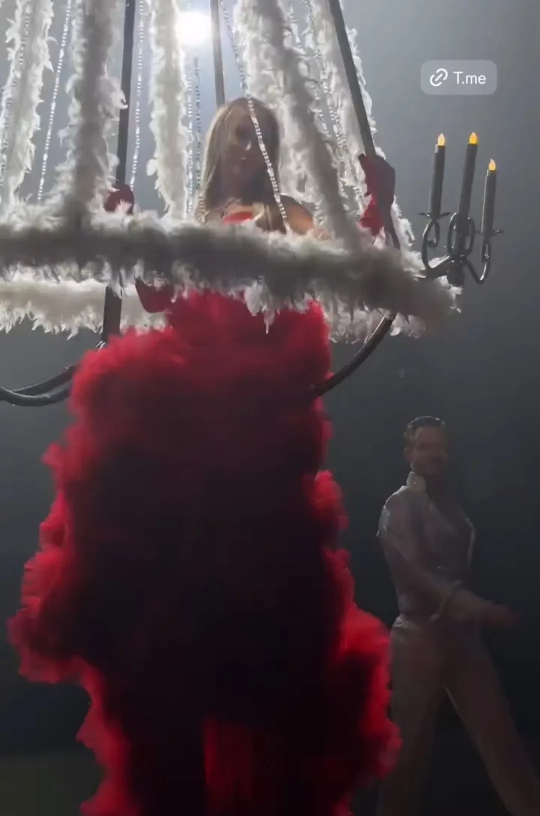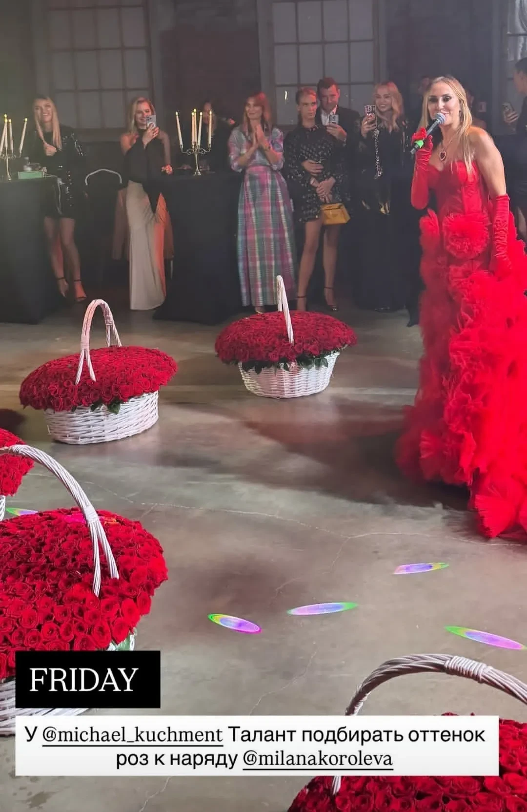 Приглашённых ожидало целое представление: сначала именинница спустилась к ним с потолка верхом на люстре, затем перед ними выступили воздушные гимнасты и группа “Моя Мишель” со своими хитами. Дресс-код и убранство помещения, украшенного множеством цветов, были в красном и черном оттенках.