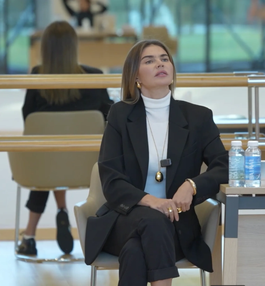 Вчера Алина появилась в зале в чёрном брючном костюме, белой водолазке и ботинках, дополнив образ золотыми украшениями: массивной подвеской, серьгами, браслетом и кольцами.