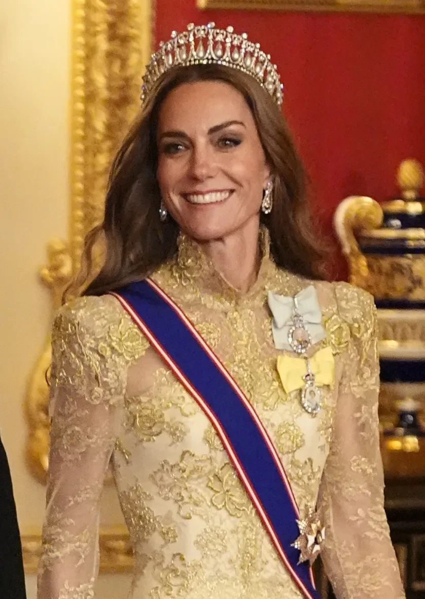 Королева Камилла и король Карл III, Дональд и Мелания ТрампНа приёме Мелания появилась в длинном ярко-жёлтом платье с лиловым бархатным поясом от Carolina Herrera, дополнив его изумрудными серьгами. Кейт блистала в вечернем платье Phillipa Lepley, расшитом золотыми кружевами Шантильи. Образ герцогини завершали туфли Aquazzura, клатч Anya Hindmarch, тиара "Узелки любви" и бриллиантовые серьги. Их мужчины, Дональд Трамп и принц Уильям, были в чёрных смокингах.