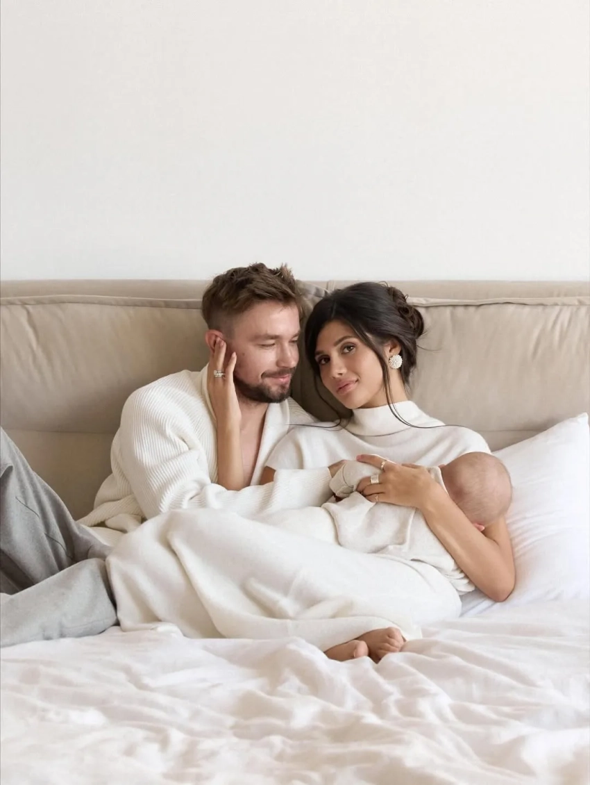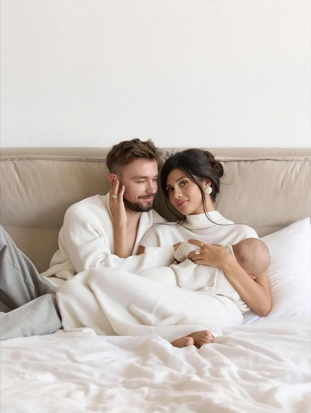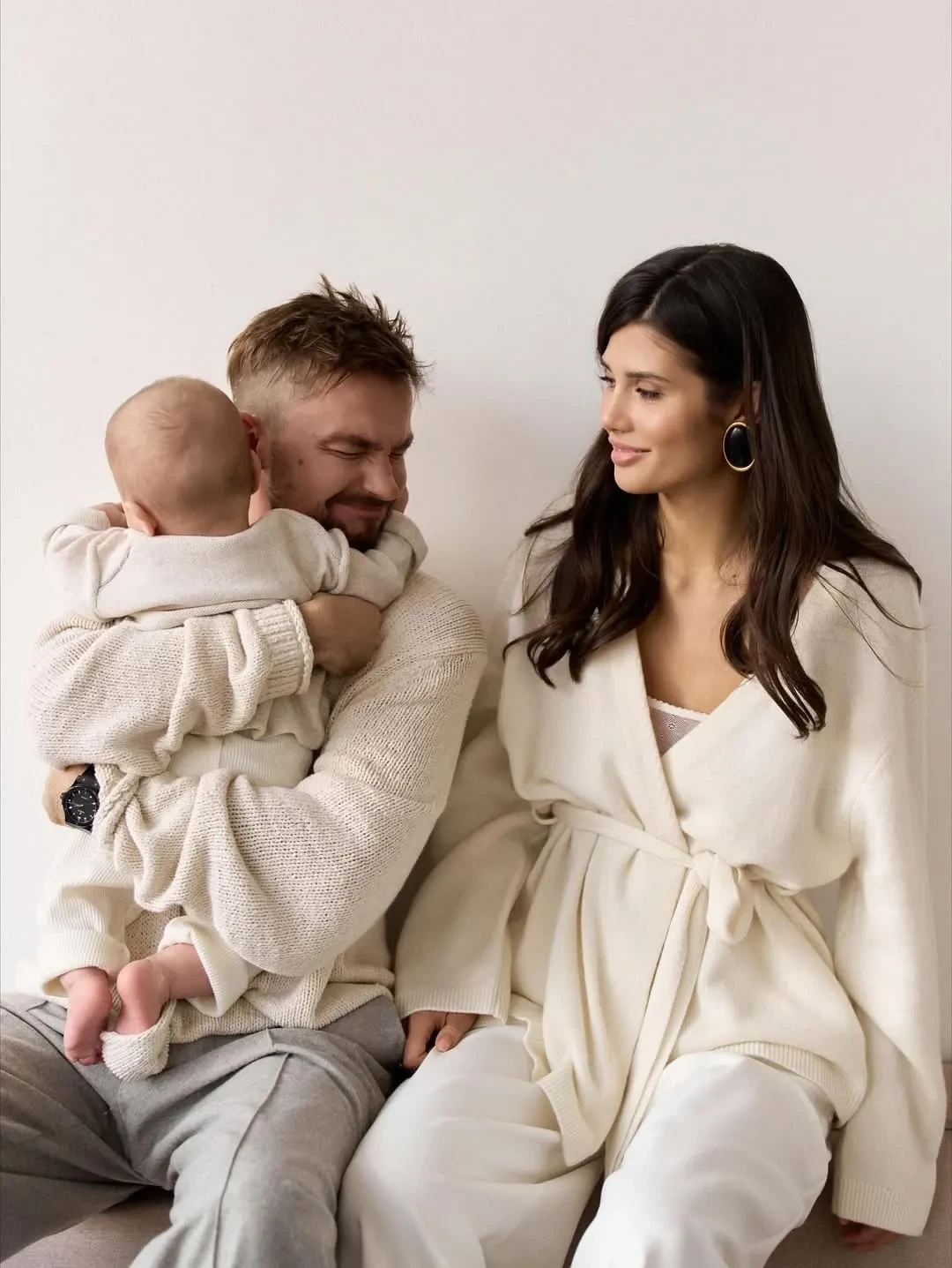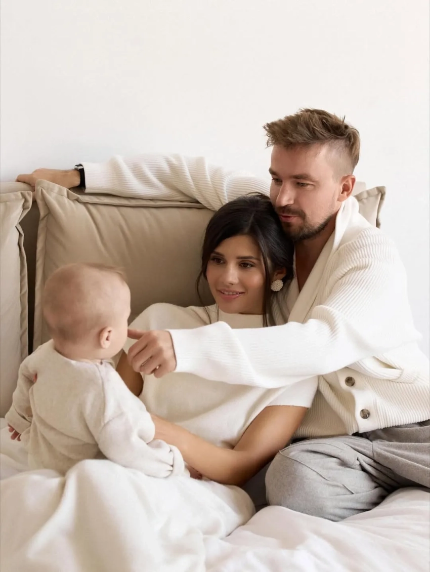 На снимках можно увидеть Викторию и Александра, играющих с сыном, при этом все трое одеты в одежду сочетающихся светлых оттенков. На одном из кадров Петров крепко прижимает Фёдора к себе, а на другом целует жену в губы, пока та держит ребёнка на руках.