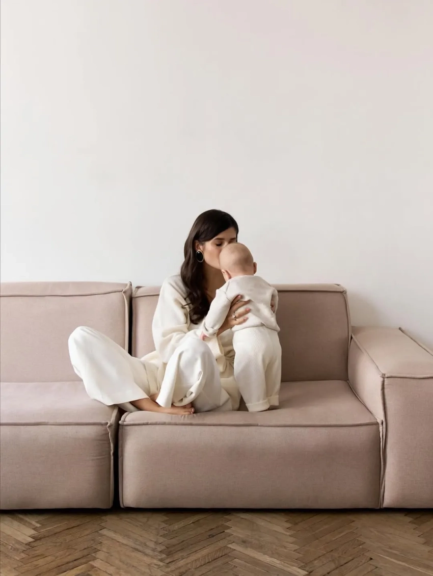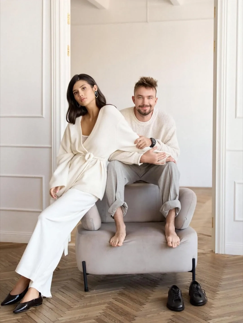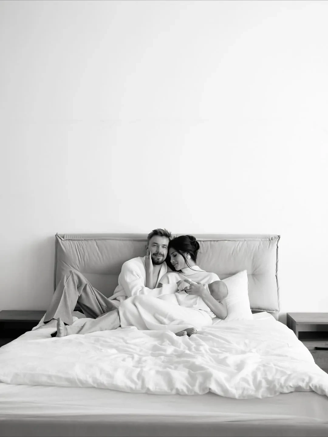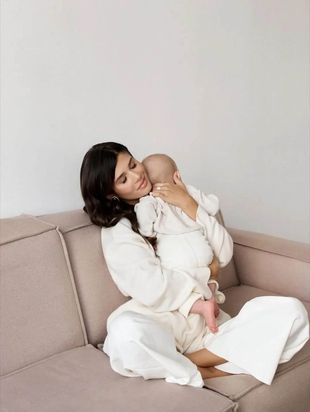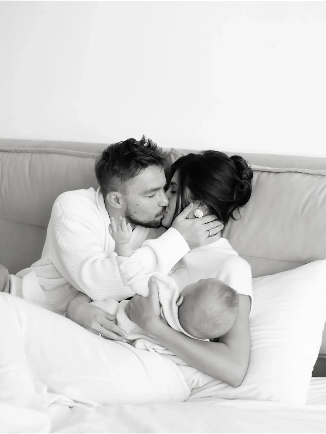На снимках можно увидеть Викторию и Александра, играющих с сыном, при этом все трое одеты в одежду сочетающихся светлых оттенков. На одном из кадров Петров крепко прижимает Фёдора к себе, а на другом целует жену в губы, пока та держит ребёнка на руках.