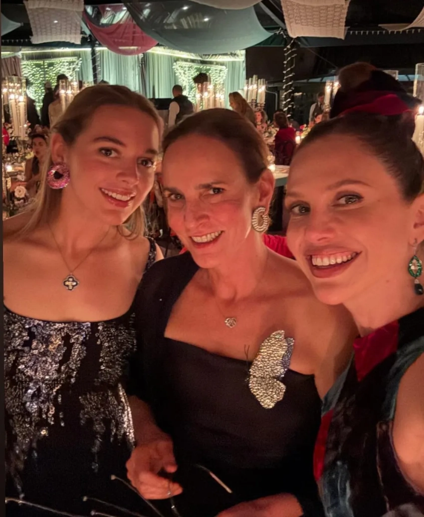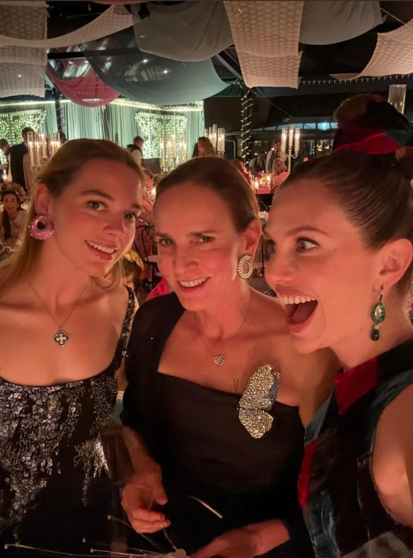 На снимках Жукова позирует в бархатном платье и с высокой причёской в компании художницы и родственницы своего мужа, миллиардера Ставроса Ниархоса Евгении Ливанос, а также её дочери Талии.