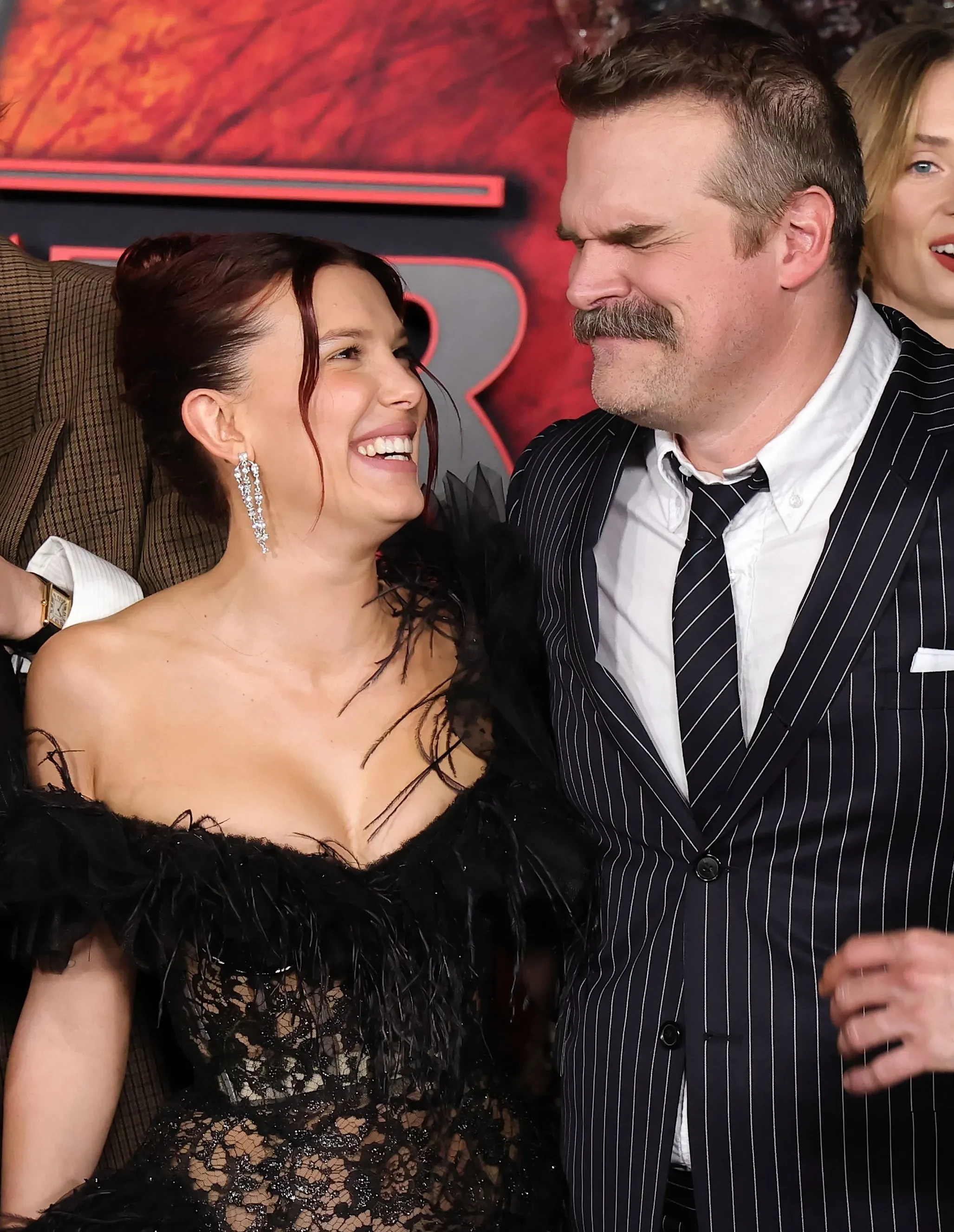 21-летняя Милли Бобби Браун позировала на дорожке с 50-летним Дэвидом Харбором, которого недавно обвинила в издевательствах во время съёмок, а также на фоне его скандального развода с Лили Аллен. Коллеги улыбались и обнимали друг друга перед фотографами, будто между ними никогда не было конфликтов.