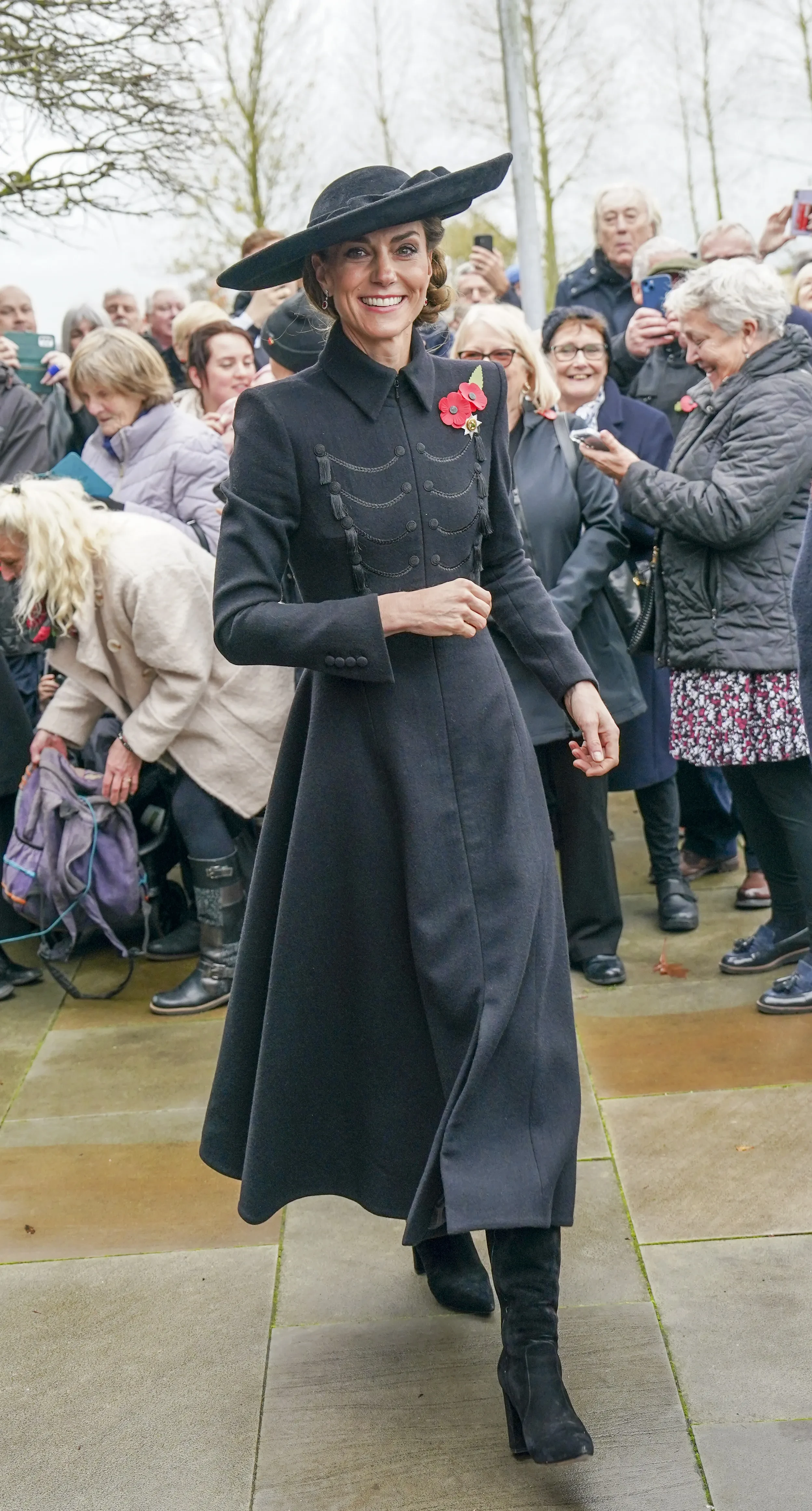 На мероприятии 43-летняя принцесса Уэльская появилась в чёрном платье-пальто Catherine Walker. Образ она дополнила шляпой с широкими полями Jane Taylor, короткими перчатками и сапогами на каблуке Gianvito Rossi. Из украшений Кейт выбрала серьги с бриллиантами и рубинами, брошь Ирландской гвардии и традиционный красный мак.