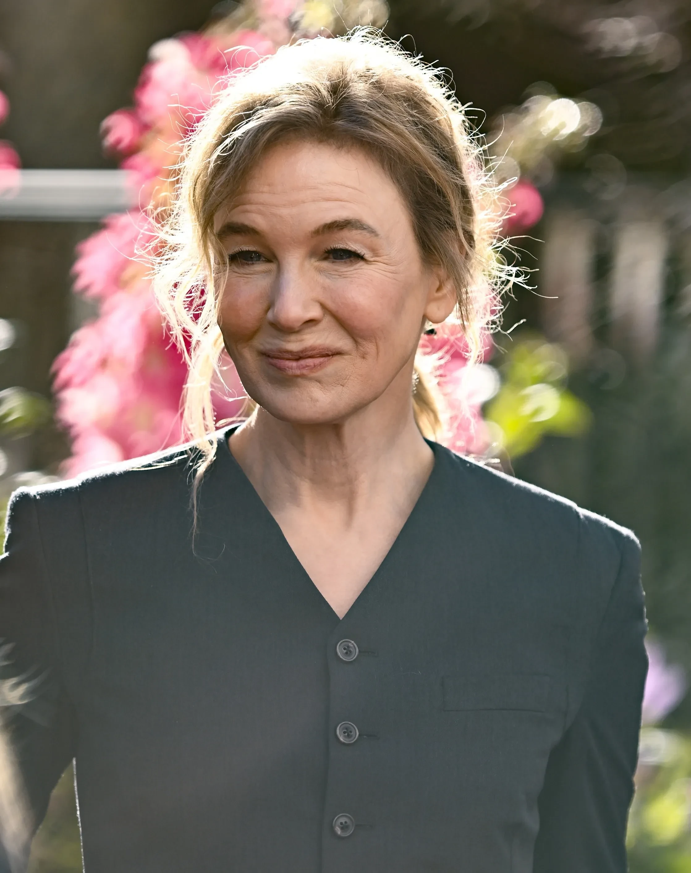 56-летняя Рене Зеллвегер позировала на фоне памятника в чёрном платье на пуговицах и белых туфлях на каблуках, а Хелен Филдинг пришла в кожаном пальто с мехом и сапогах.