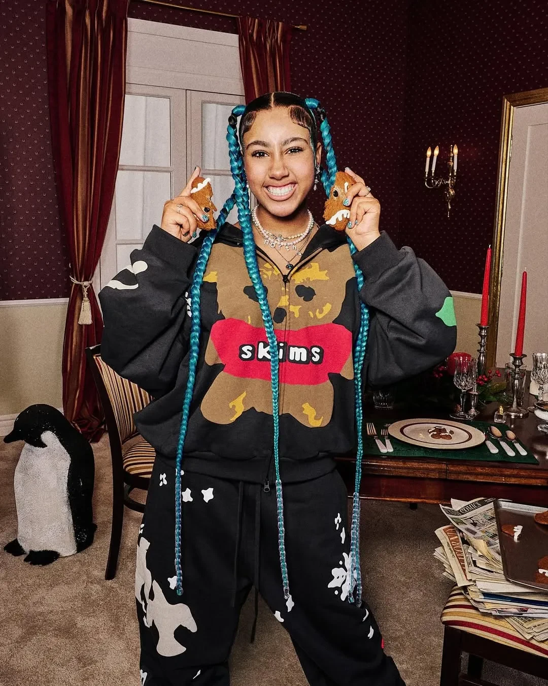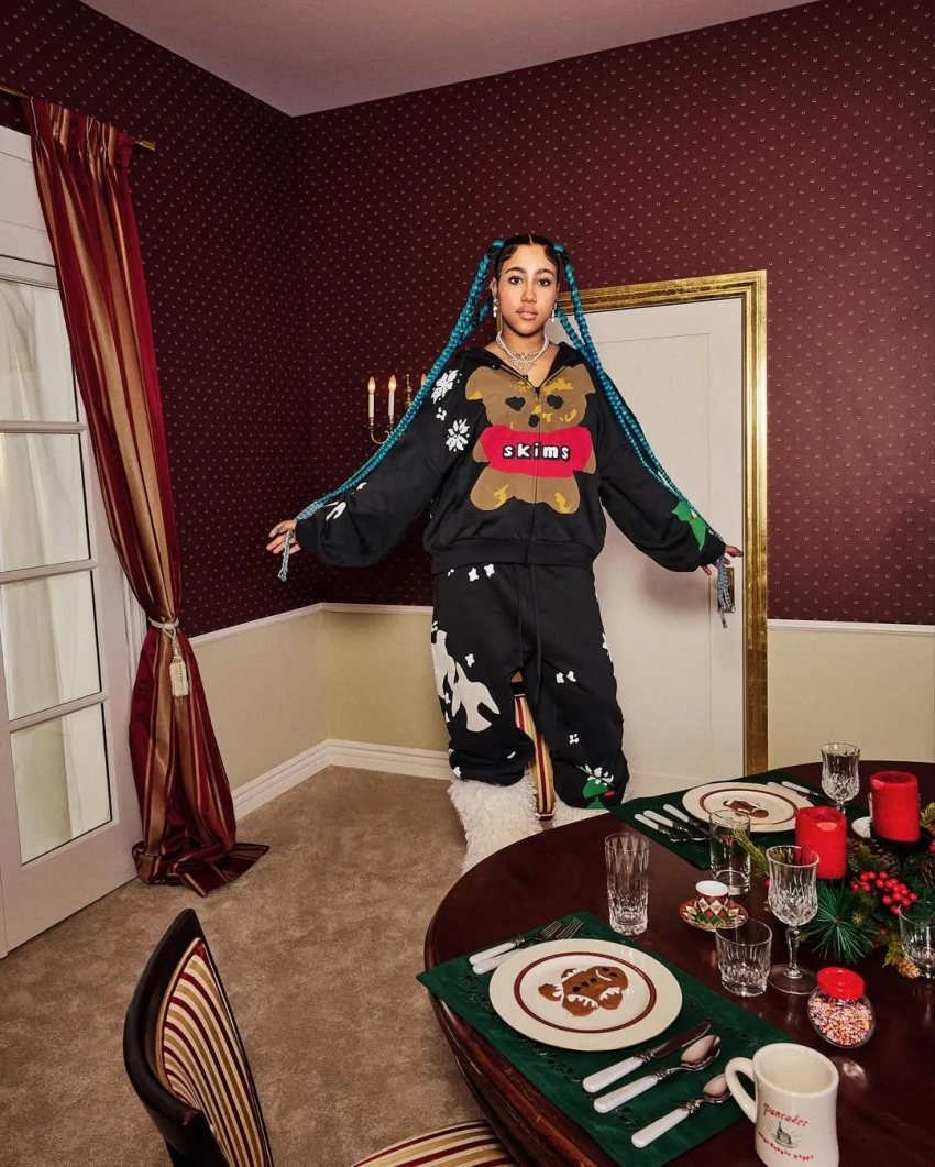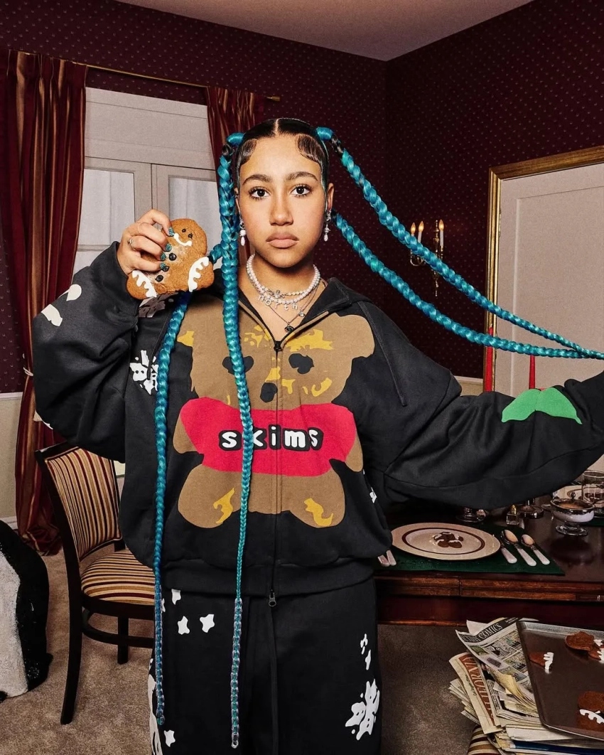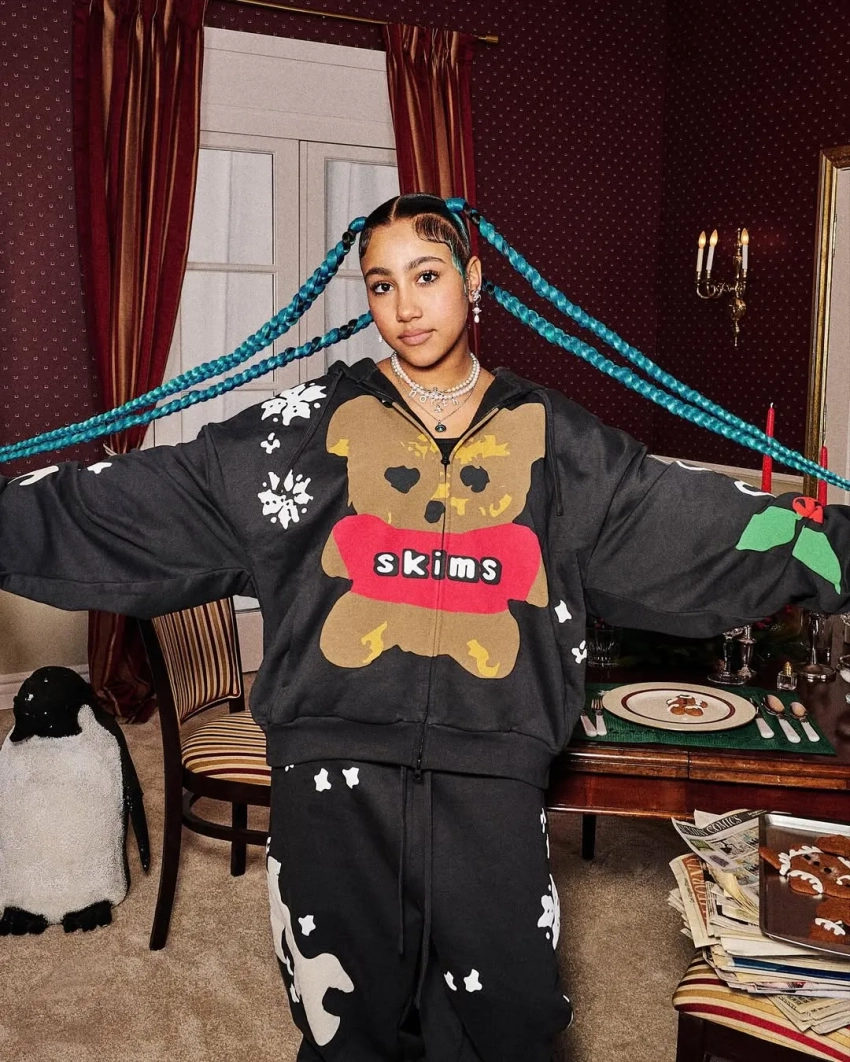 Норт появилась в проморолике с длинными голубыми косами и в чёрном спортивном комплекте. В финале ролика Норт уверенно говорит: "Все носят Skims". Интересно, что это уже не первый раз, когда Норт снимается для бренда матери: первый такой опыт у неё был ещё в 2020 году вместе с матерью и сестрой Чикаго.