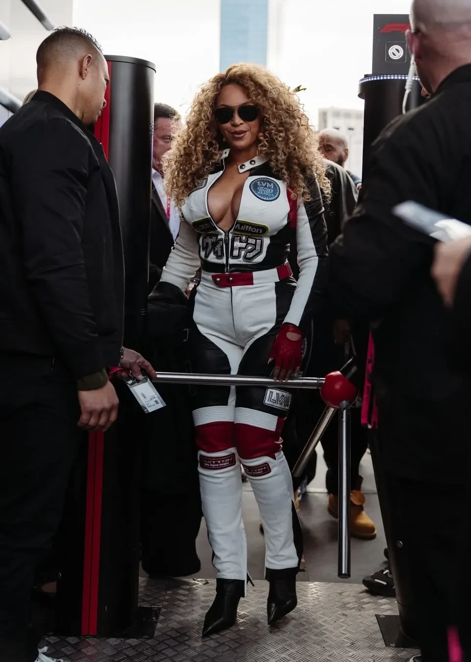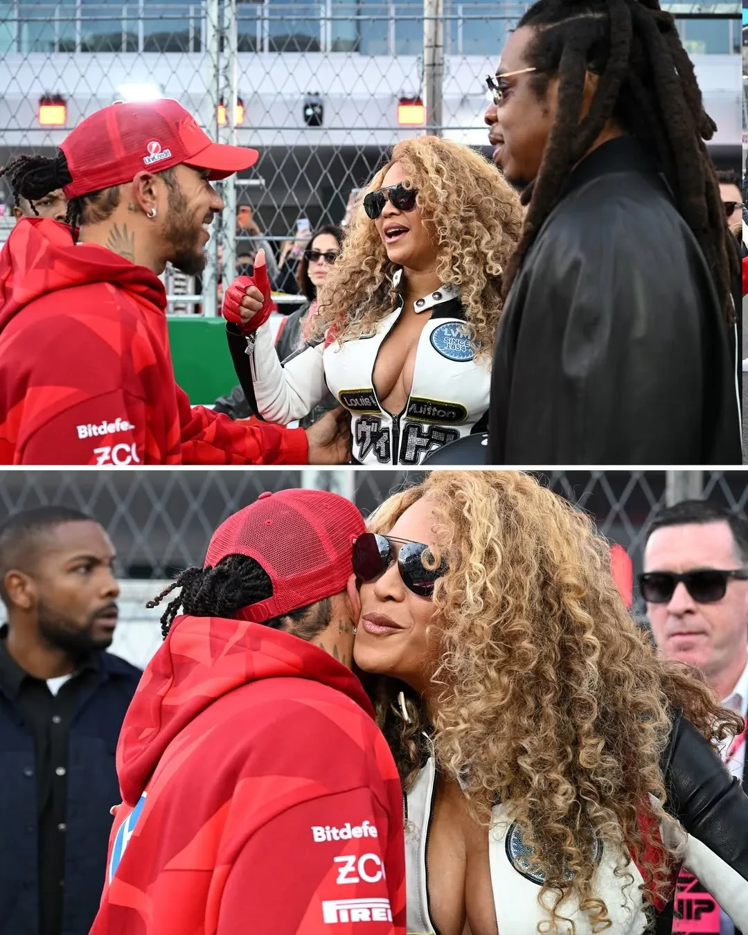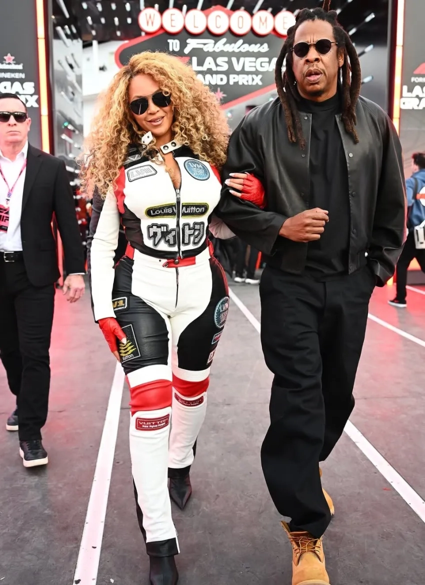 44-летняя Бейонсе пришла в кожаном мотокостюме Louis Vuitton с декольте и вместе с гонщиком Льюисом Хэмилтоном прокатилась на красном автомобиле Ferrari. А 55-летняя Наоми Кэмпбелл позировала на соревнованиях в тренче со змеиным принтом и солнцезащитных очках.