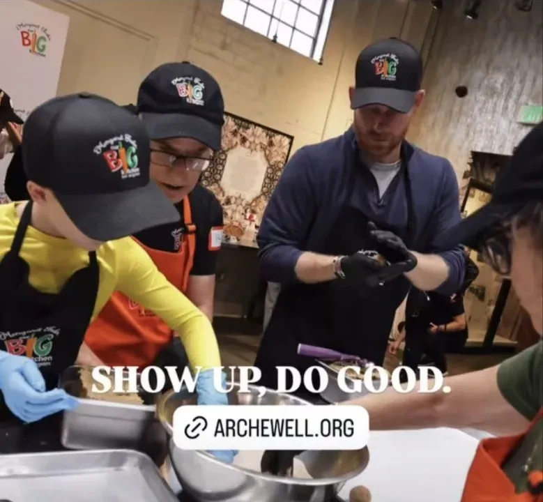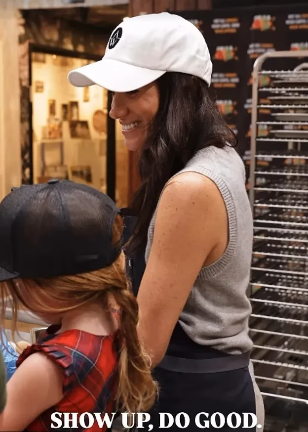 В своих сторис* Меган выложила фото, как они вместе с мужем помогают печь печенье и раскладывать продукты по контейнерам за большими столами вместе с другими волонтёрами. При этом в кадр попали их дети — шестилетний Арчи и четырёхлетняя Лилибет, одетые в кепки и фартуки с логотипом организации. Судя по всему, они тоже приняли участие в работе.