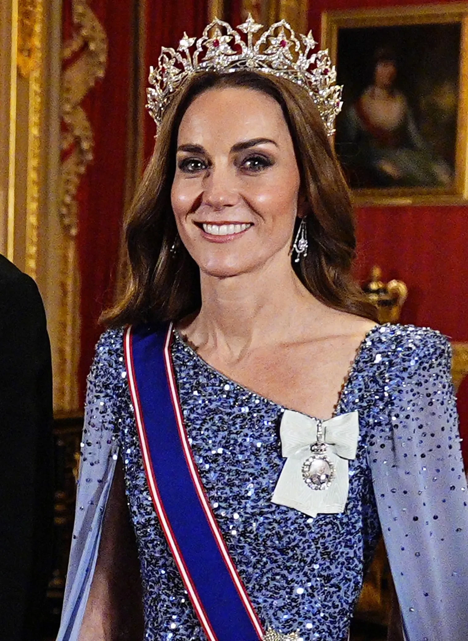 43-летняя Кейт Миддлтон появилась на банкете в платье из пайеток с кейпом Jenny Packham, но больше всего внимания привлекла редкая тиара из коллекции королевы Виктории — самая большая из всех, что принцесса Уэльская когда-либо носила. Тиара Oriental Circlet была изготовлена в 1853 году: она украшена бриллиантами и рубинами в виде сверкающих лотосов и арок в стиле Великих Моголов. Однажды в этом украшении выходила в свет королева Елизавета II — во время поездки на Мальту в 2005 году.