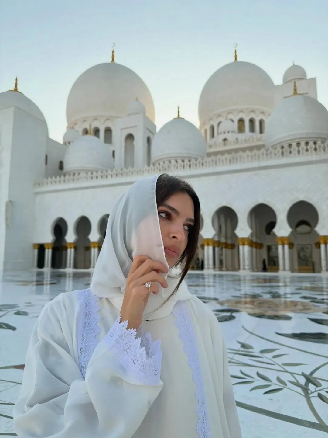 На новых снимках Ратаковски, которая часто публикует откровенные фото и выходит в свет в "голых" платьях, позирует около Большой мечети шейха Зайда в белой одежде и с покрытой головой.