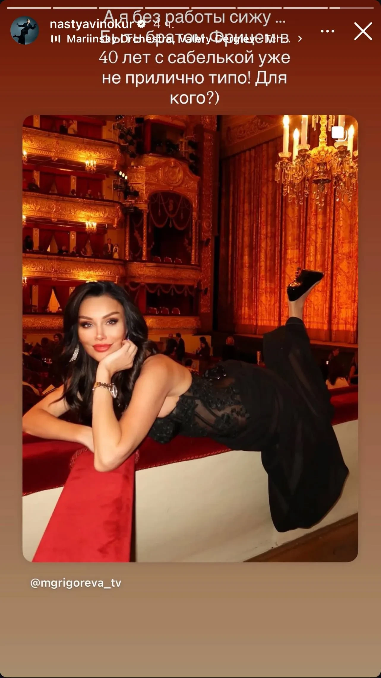 Несколько дней назад Григорьева, которая, судя по её соцсетям, часто посещает театры, выложила серию снимков с балета "Дочь фараона". Среди них оказалось фото, где она лежит на бортике ложи. Более того, позже выяснилось, что это не единственный подобный кадр в её профиле.