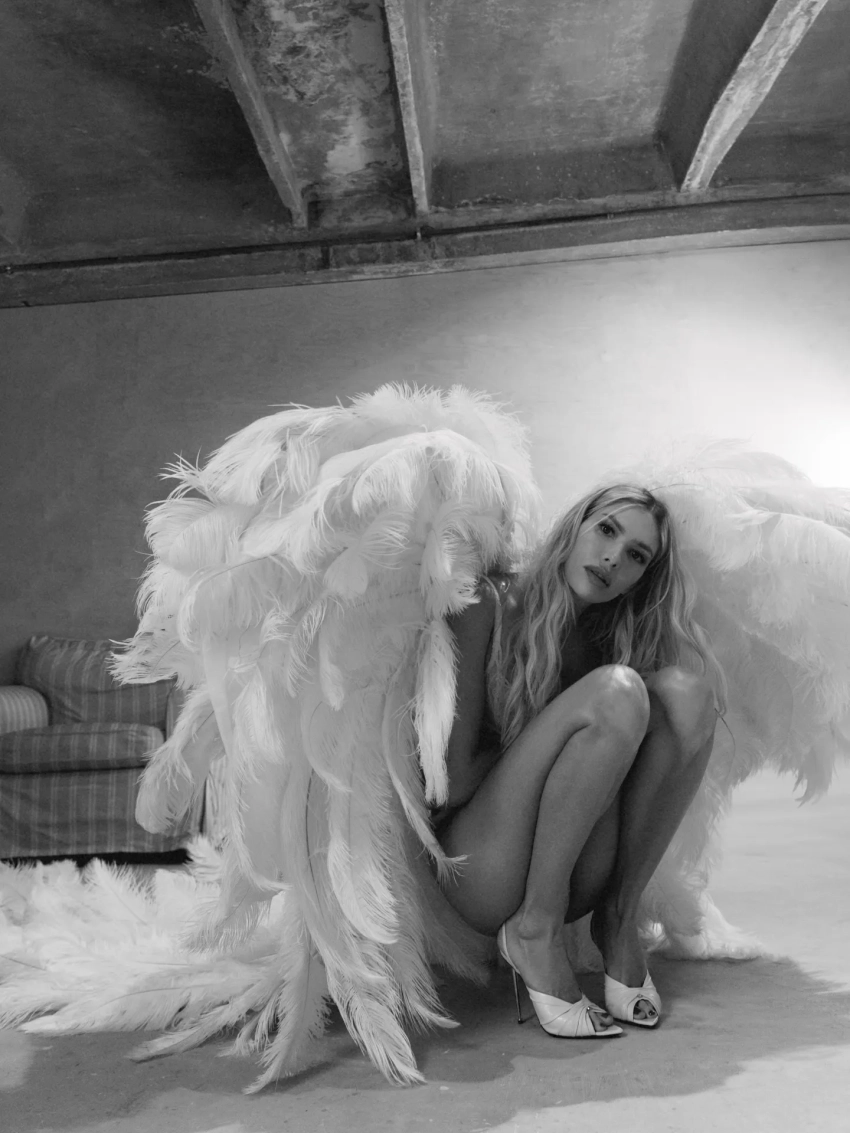 Для съёмки Перминова примерила белый кружевной комплект нижнего белья. Образ завершили туфли на шпильке и массивные ангельские крылья в тон наряду.