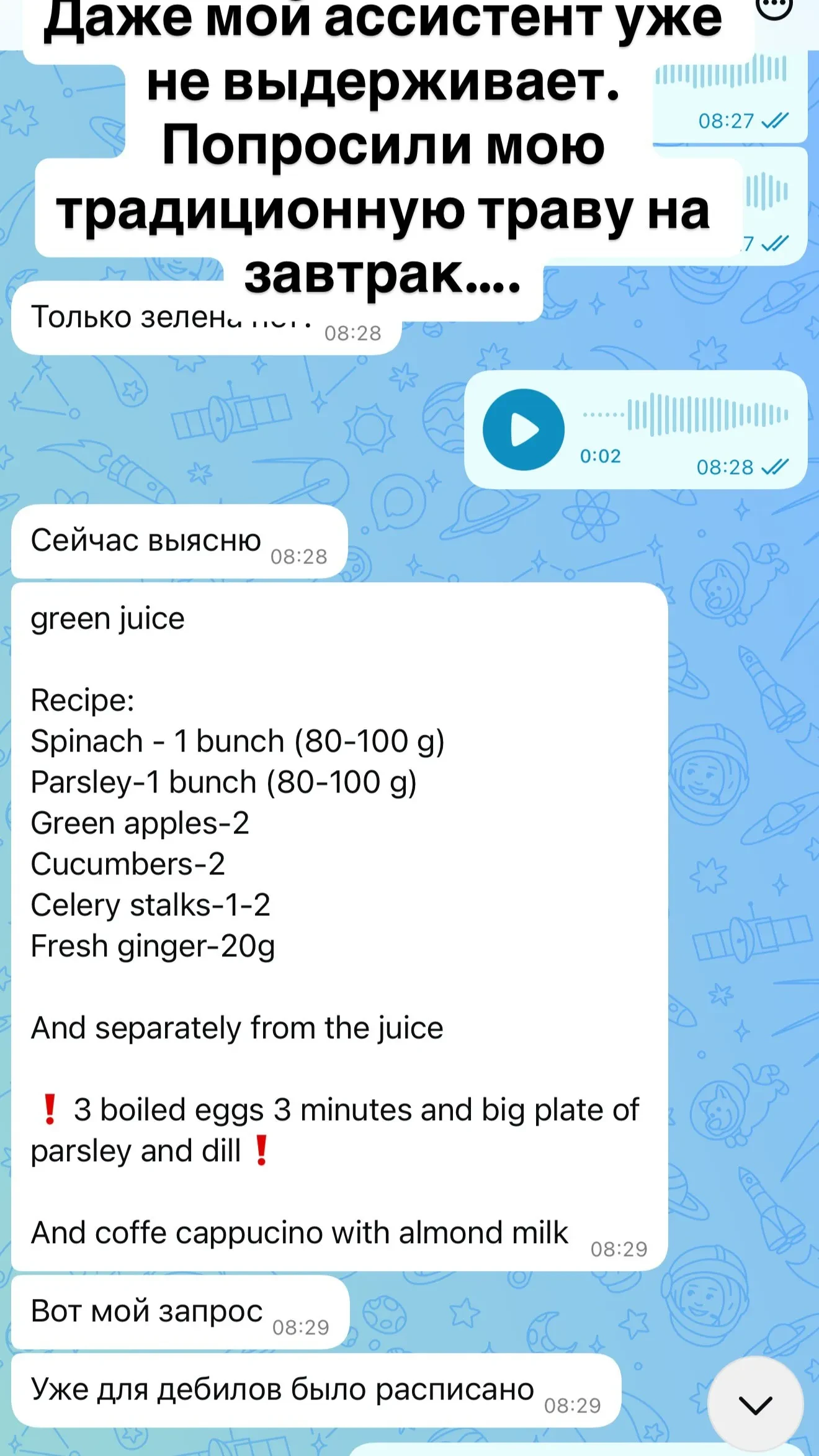 Скриншот из сторис* Ксении СобчакСкриншот из сторис* Ксении СобчакСобчак высказалась и по поводу питания в пятизвёздочном отеле. Помощник звезды пытался заказать ей "зелёный сок" из определённых ингредиентов (зелёные яблоки, огурец, сельдерей, имбирь, петрушка и шпинат), а также два варёных яйца, тарелку зелени и капучино, но в итоге Ксении пришлось есть салат "Айсберг". "Даже мой ассистент уже не выдерживает. Попросили мою традиционную траву на завтрак".