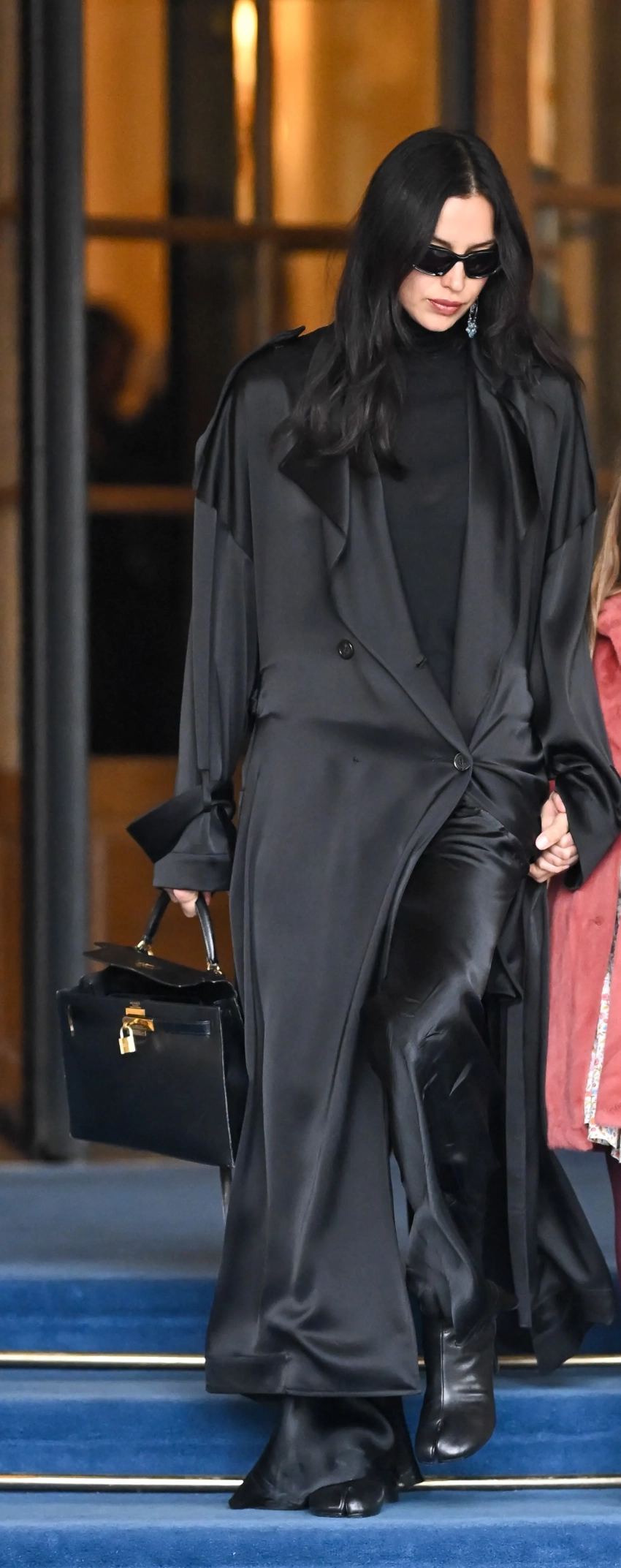 Шейк, которой недавно исполнилось 40 лет, засняли с дочерью на выходе из отеля Ritz. Перед камерами модель появилась в шёлковом жакете в сочетании с шёлковыми брюками в тон и ботинками Maison Margiela Tabi. Свой образ она завершила чёрной сумкой Hermеs Kelly.