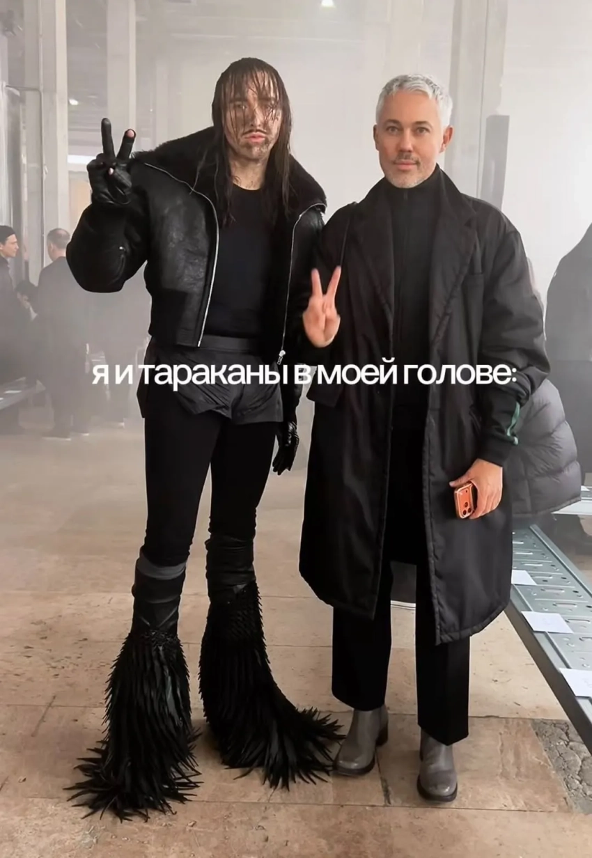 Стилист Александр Рогов и основательница концепт-стора "КМ20" Ольга Карпуть несколько дней назад посетили показ бренда Rick Owens в рамках Недели мужской моды в Париже. Снимками своих образов звёзды поделились в соцсетях.