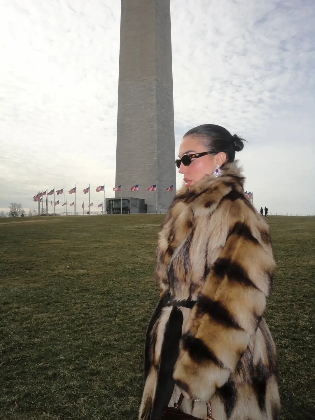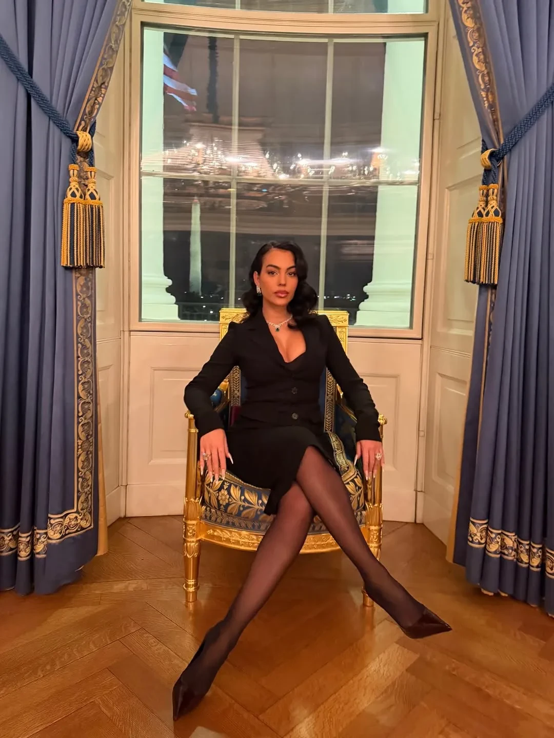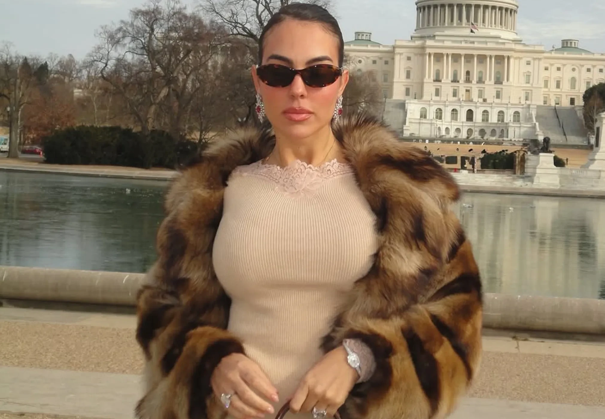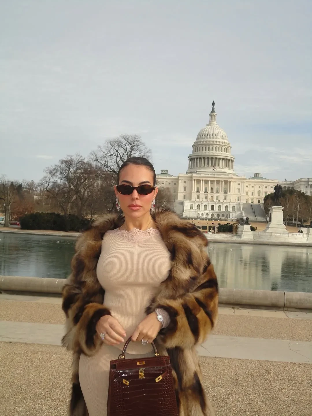 Родригес показала в соцсетях фото из Белого дома, где она позирует в чёрном костюме и ювелирных украшениях. Среди них, конечно, помолвочное кольцо от Роналду с бриллиантом в 30 каратов. Невеста футболиста прилетела в США на частном джете и, чтобы не замёрзнуть в холодном Вашингтоне, нарядилась в шубу. Её образы дополнили сумки Hermes и бриллианты.