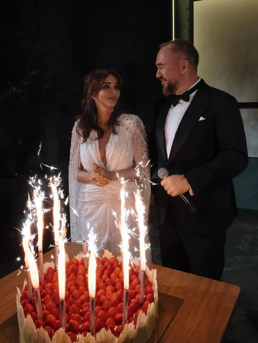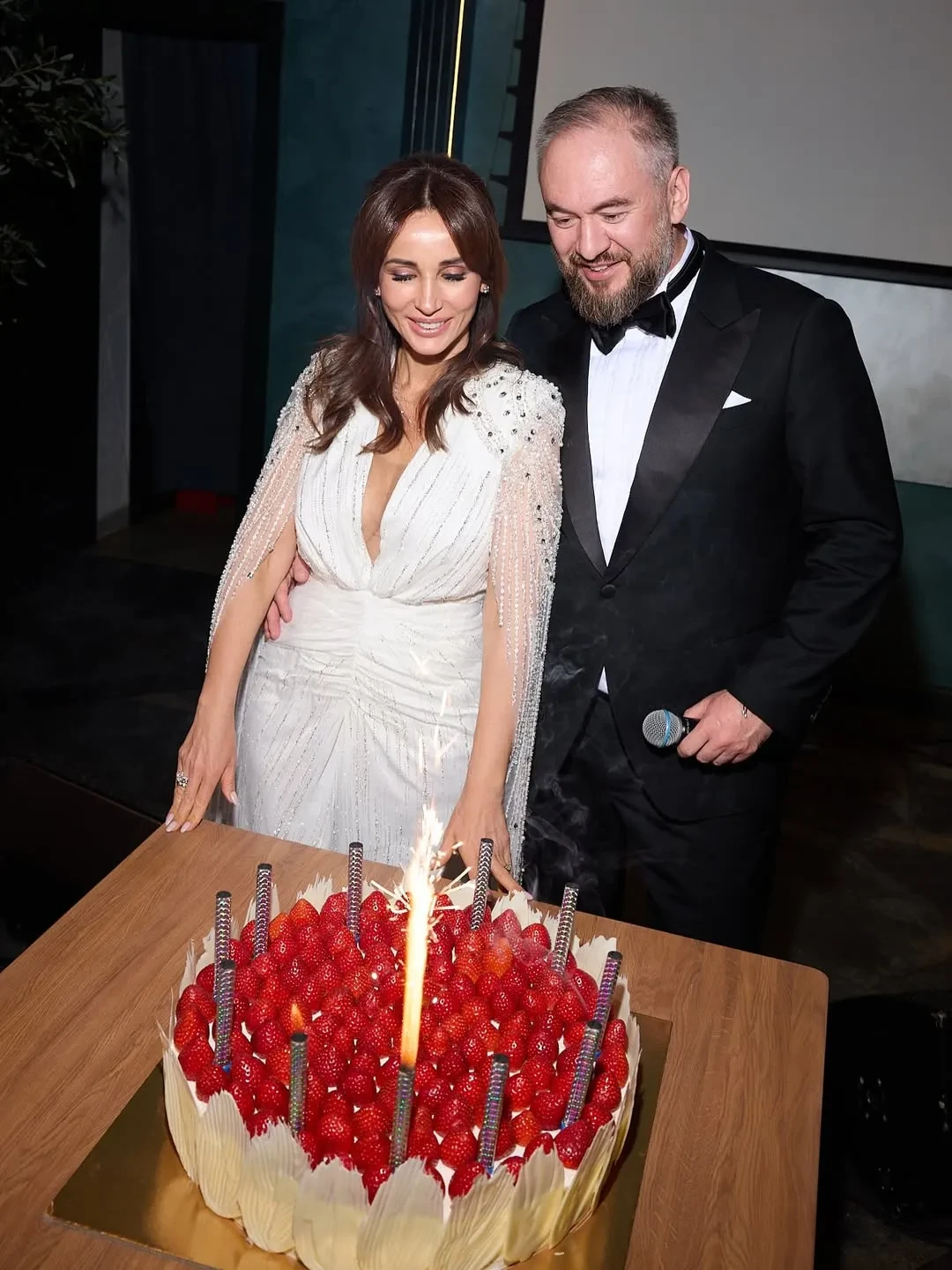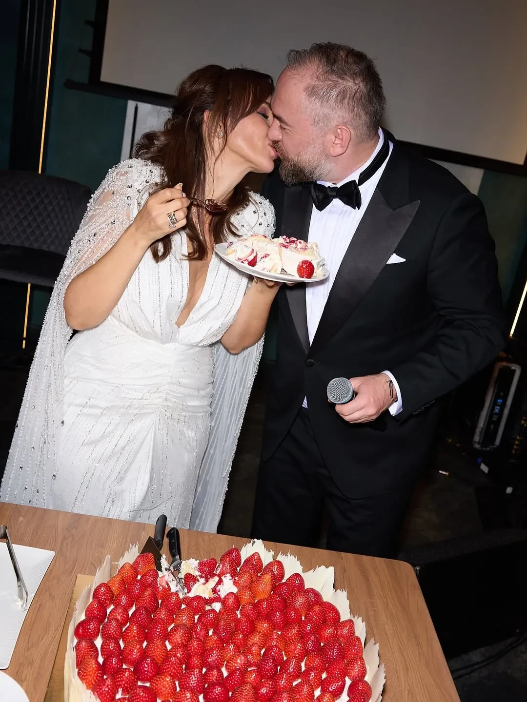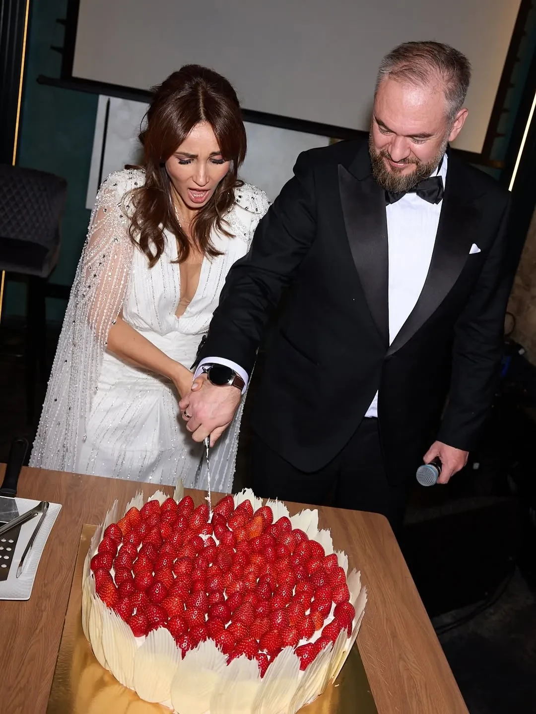 Фото Анфисы ЧеховойНа роспись в ЗАГСе ведущая пришла в белом комбинезоне бренда Ammonit, а на вечеринку переоделась в платье Magirani с декольте. В начале празднования жених и невеста станцевали танец молодожёнов под хит Селин Дион All By Myself, а после отмечали с гостями и тамадой.
