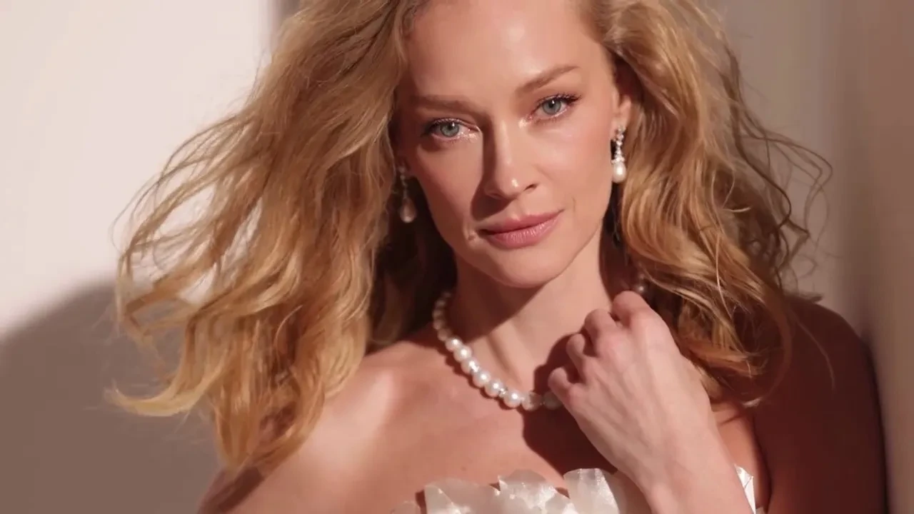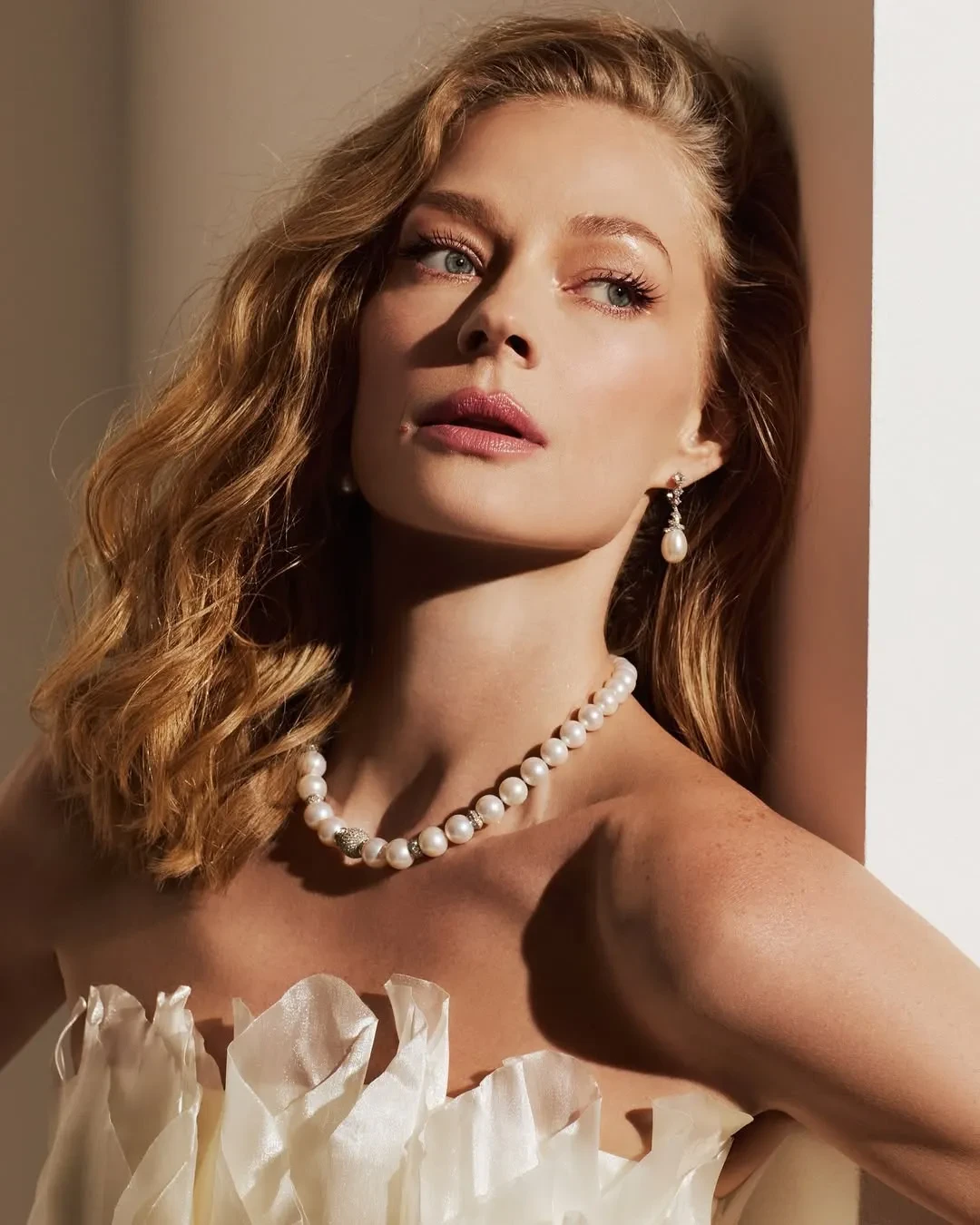 Ходченкова попозировала для съёмки в белом платье, дополнив свой образ колье и серьгами с жемчугом.