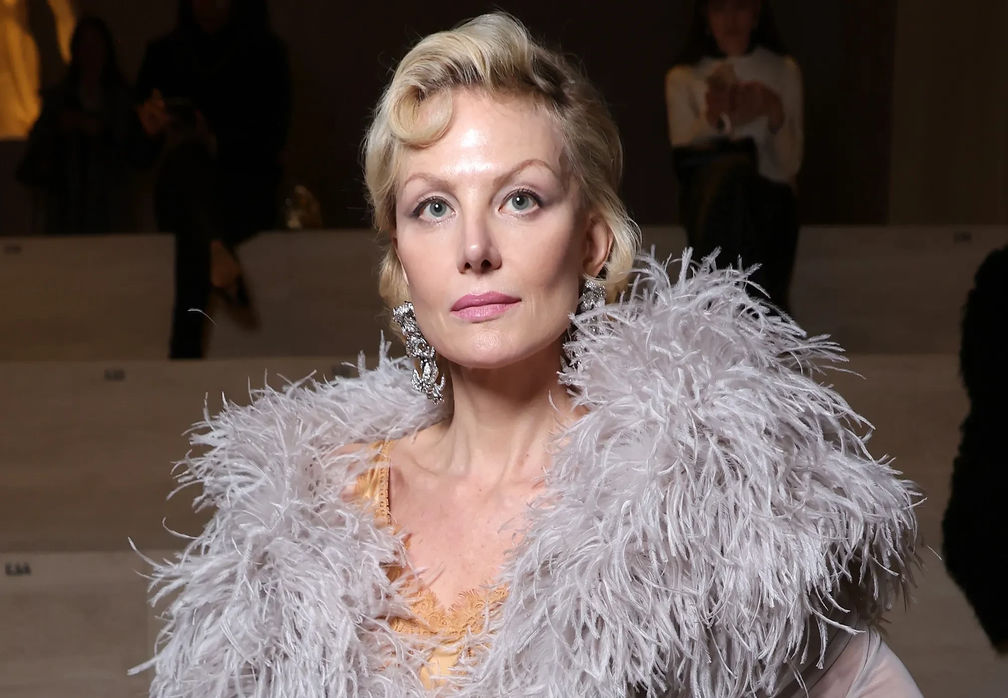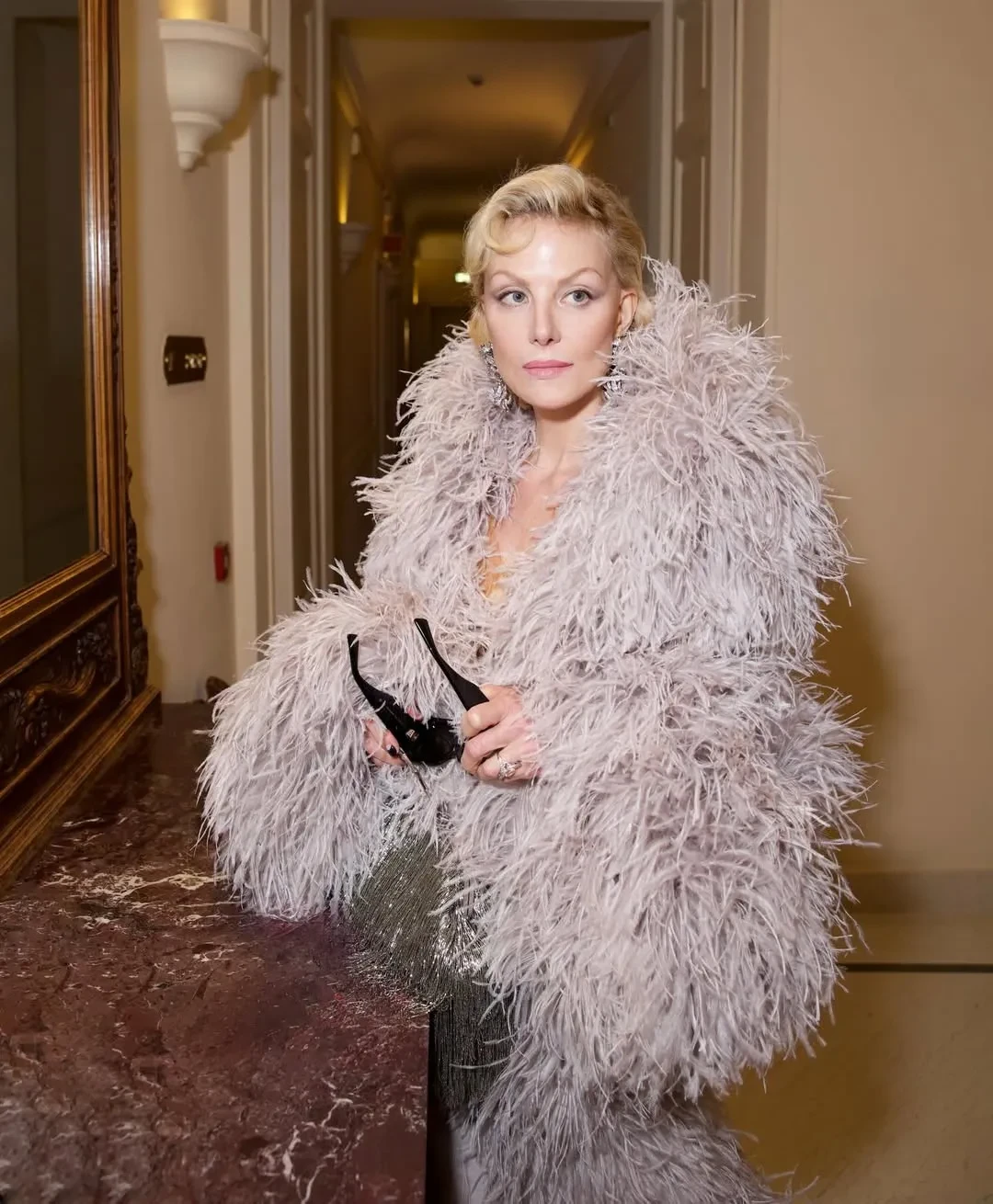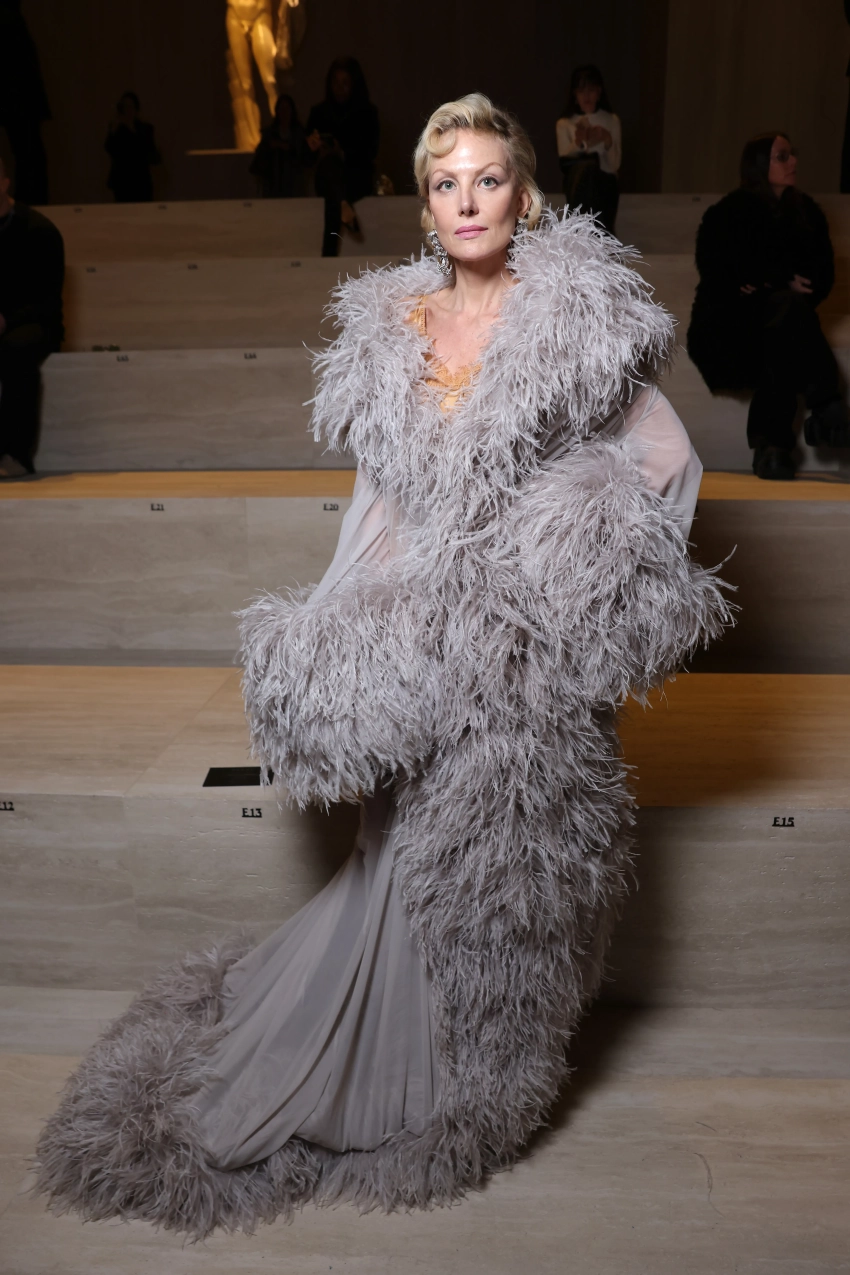 Литвинова отправилась на шоу в длинном платье Gucci с перьями. Образ дополнили серебристая сумка с бахромой, массивные серьги с бриллиантами и солнцезащитные очки.