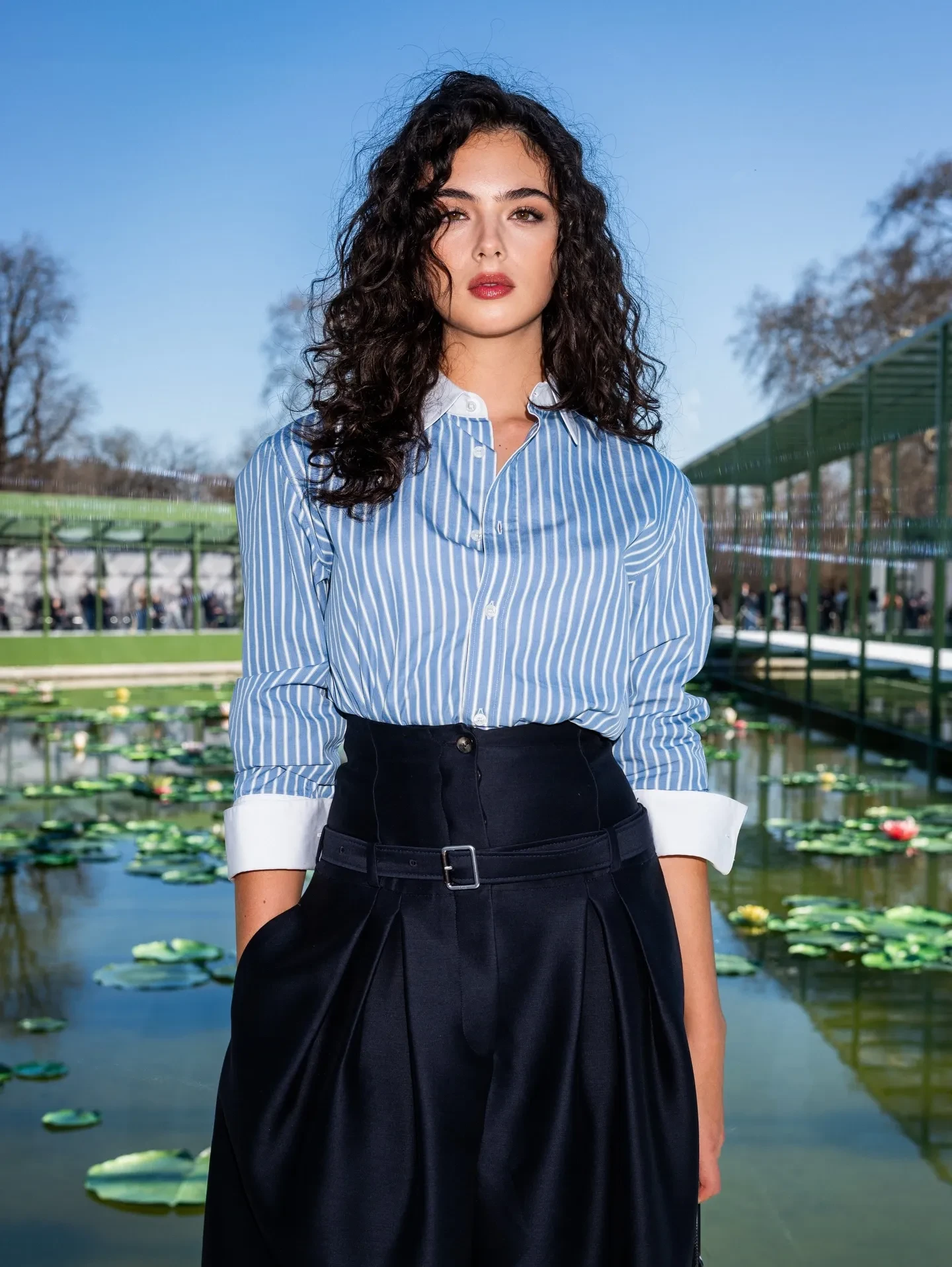 21-летняя Дева Кассель появилась в саду Тюильри, который выступил площадкой для показа, в синей рубашке в полоску и чёрной юбке-миди, дополнив наряд сумочкой и лодочками на невысокой шпильке. 50-летняя Шарлиз Терон выбрала total black образ: на ней была кожаная мини-юбка, топ и накидка с бантом на шее. 18-летняя Эвер Андерсон, ставшая недавно лицом Dior, блистала в приталенном платье-пальто в коричневую клетку.