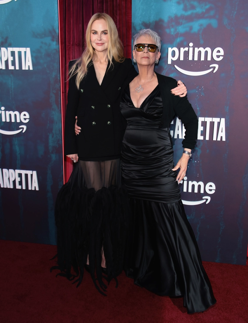 На красной дорожке обладательница "Оскара" появилась в чёрном пиджаке на голое тело и прозрачной юбке. Фотографам она попозировала с исполнительницей ещё одной роли в проекте — другой своей оскароносной коллегой Джейми Ли Кёртис.