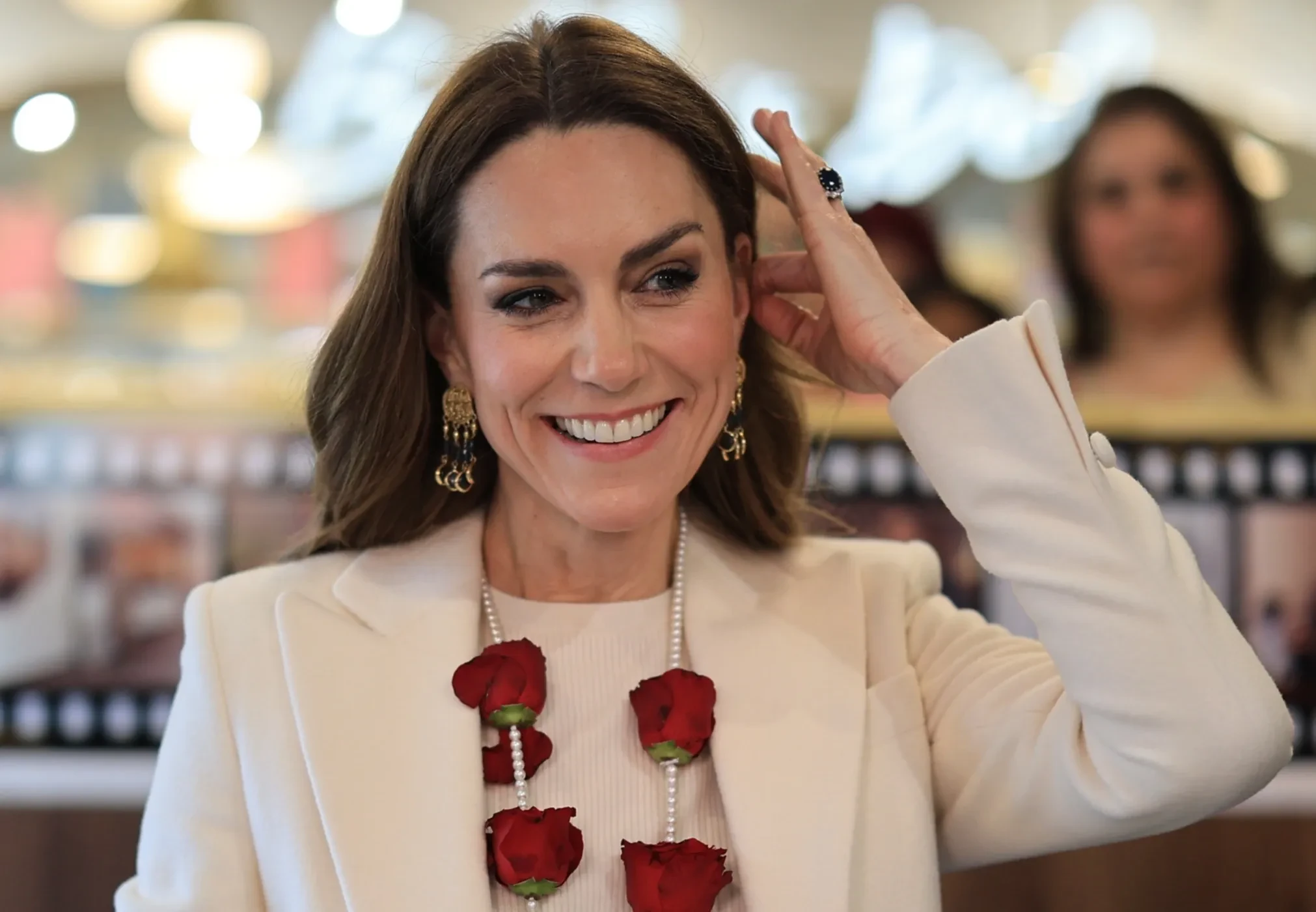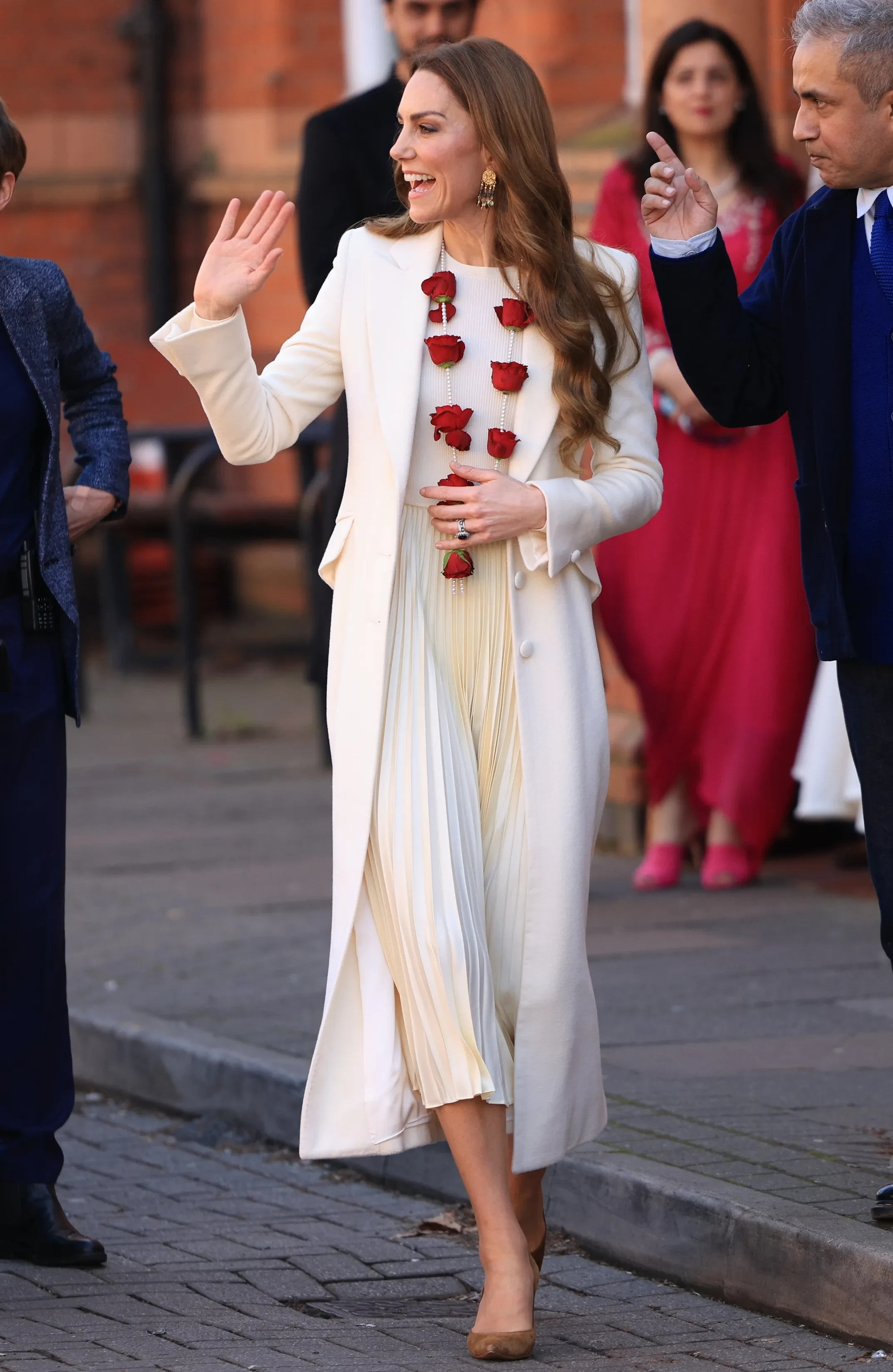 Соблюдая традицию, согласно которой в этот праздник принято носить одежду в светлых тонах, принцесса Уэльская выбрала белое пальто и кремовое платье от Ralph Lauren. Образ она дополнила золотыми серьгами, бежевыми лодочками и ожерельем из роз и жемчуга, которое ей вручили по прибытии.