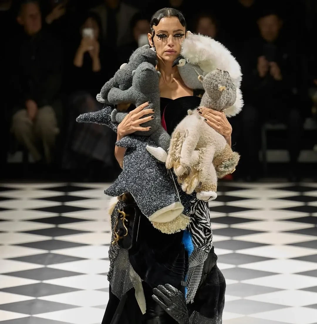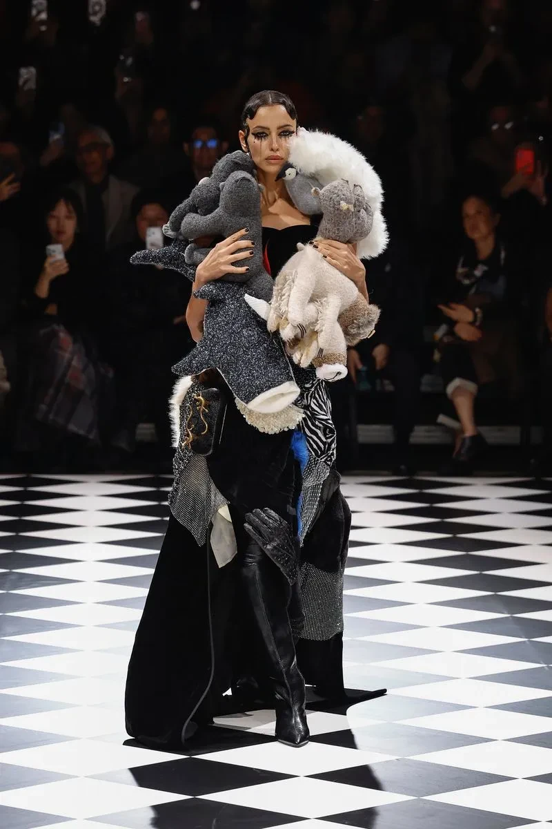 Шейк открыла показ японского бренда в чёрном платье с пышной юбкой. Вторым образом стал наряд с накидкой из мягких игрушек. Образы звезды дополнил макияж с "заплаканными глазами".