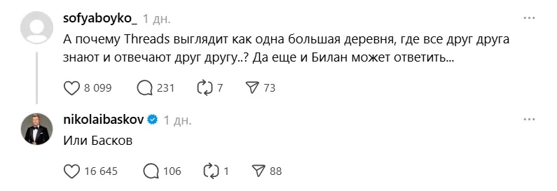 Всю последнюю неделю пользователи Threads* удивляются неожиданной активности отечественных звёзд в этой соцсети. В частности, за "захватом" запрещённого на территории РФ сервиса стоят Дмитрий Билан, Николай Басков и Григорий Лепс. Теперь в сети шутят, что некогда пустующая платформа превратилась в филиал "Золотого граммофона", а к вирусному тренду присоединяется всё больше селебрити.