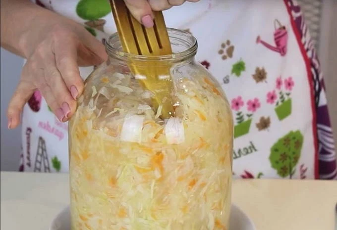 Ежедневно протыкайте капусту деревянной палочкой до дна, чтобы выходили газы.
