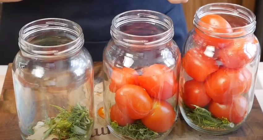 Температура маринада — около 85–90 °C. Слишком горячий маринад размягчит помидоры.