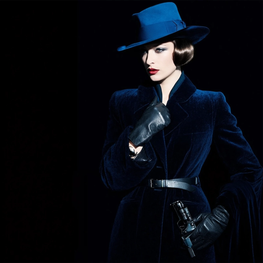 Длинное пальто, шляпа-федора, белая рубашка и темная помада — и вы словно сошли со страниц чёрно-белого комикса. Такой костюм не требует лишних деталей, а смотрится невероятно стильно.