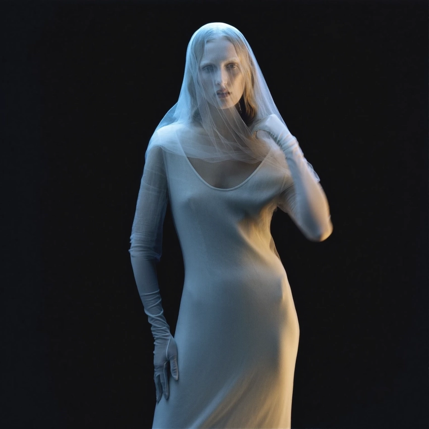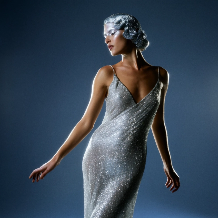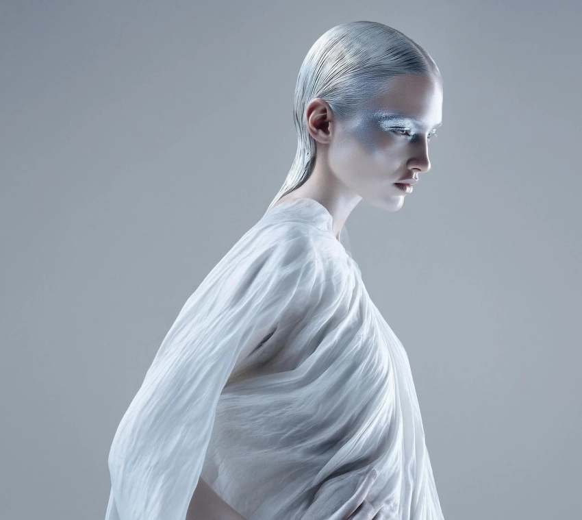 Мягкое серебро, сияющие ткани и плавные линии создают загадочный и космический образ. Монохром в бело-серых оттенках делает его утончённым и выразительным.